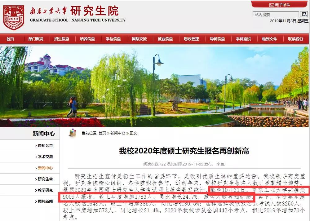 截至10月31日,南京工業大學共接受9009人報考,較上年度增加1783人,同比增長24.7%,報名人數再創新高。2020年南京工業大學擬計劃招收碩士研究生2300名左右。