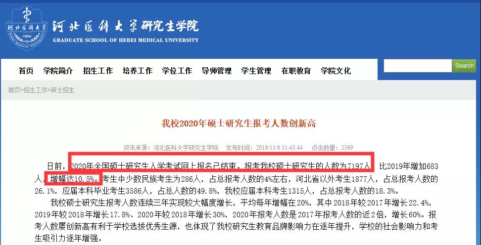 河北醫科大學2020年報考人數7197人,增幅達10.5%。擬定2020年碩士生招生總規模1157名(含長學制及推薦免試生)。