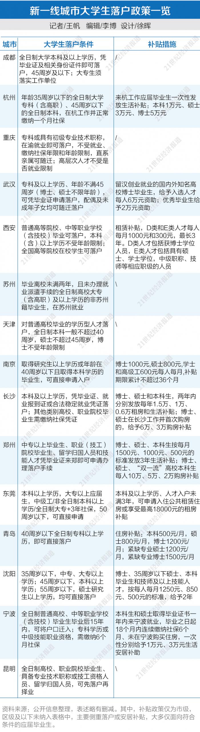 正值秋招季,21世紀經濟報道記者梳理了15座新一線城市最新的大學生落戶政策。根據《2019城市商業魅力排行榜》,這15座城市分別為成都、杭州、重慶、武漢、西安、蘇州、天津、南京、長沙、鄭州、東莞、青島、沈陽、寧波和昆明。