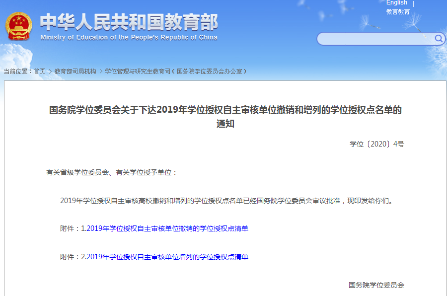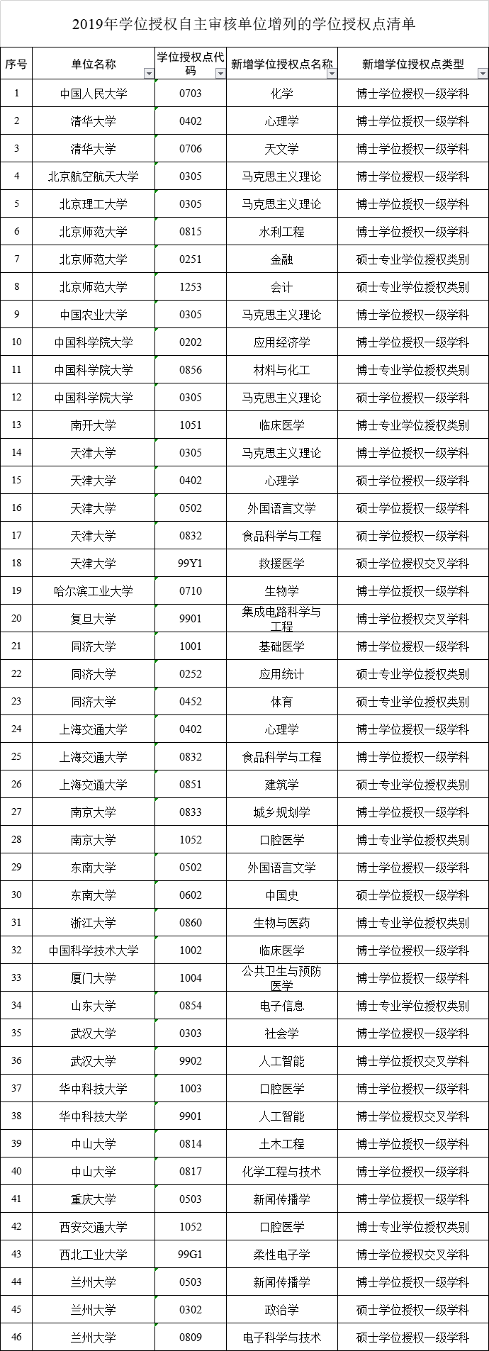 《國務院學位委員會關于下達2019年學位授權自主審核單位撤銷和增列的學位授權點名單的通知》,公布了2019年學位授權自主審核高校撤銷和增列的學位授權點名單,增列46個學位授權點,撤銷三個學位授權點。原文如下: