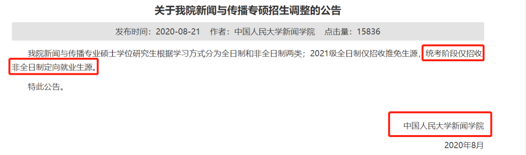 2020年8月21日,中國人民大學新聞學院發布《關于我院新聞與傳播專碩招生調整的公告》。