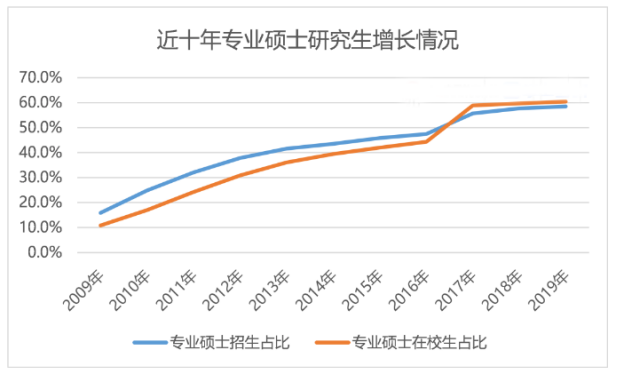 2019年,碩士研究生招生81.1萬人,專碩招生規模達47.4萬人,占比為58.5%。2019年,專業碩士研究生在校生147.4萬人,占比60.4%。