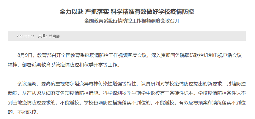 最近,隨著國內(nèi)疫情形勢的加重、大學(xué)生返校日期的逐漸臨近,疫情防控形勢越發(fā)嚴峻。教育部于8月9日召開全國教育系統(tǒng)疫情防控工作視頻調(diào)度會議,深入貫徹國務(wù)院聯(lián)防聯(lián)控機制電視電話會議精神,部署近期教育系統(tǒng)疫情防控和秋季開學(xué)等工作,一起來看!