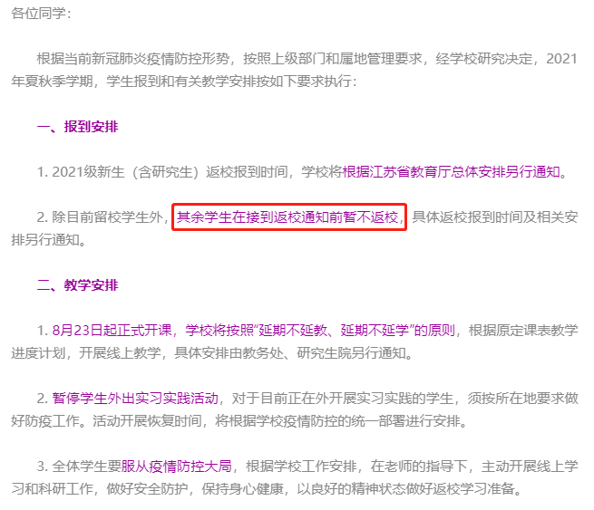 《通知》指出:學(xué)校研究決定,2021-2022學(xué)年秋季學(xué)期開學(xué)實行線上報到、網(wǎng)上授課,推遲線下報到時間,具體事宜另行通知。未經(jīng)批準,所有同學(xué)一律不得提前返校。