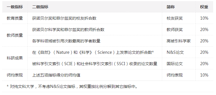 世界大學(xué)學(xué)術(shù)排名的指標(biāo)與權(quán)重:
