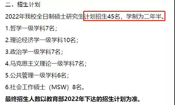 根據(jù)中共浙江省委黨校研究生教育網(wǎng)發(fā)布的《中共浙江省委黨校2022年全日制碩士研究生招生計(jì)劃》可知,2022年全日制碩士研究生共計(jì)劃招生45名,與去年招生35名相比,擴(kuò)招了10名,增幅約為28.6%,其中除社會(huì)工作碩士(MSW)依然招生8名外,其余專業(yè)分別擴(kuò)招了2名。