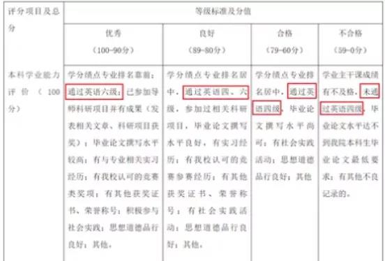 其中,通過英語六級為優秀,通過英語四、六級為良好,通過英語四級為合格,未通過英語四級直接作該項不合格處理。