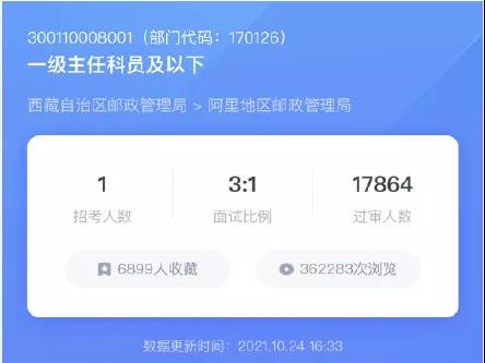 已報(bào)名崗位平均競(jìng)爭(zhēng)比超過(guò)60:1,競(jìng)爭(zhēng)非常激烈,其中西藏自治區(qū)郵政管理局阿里地區(qū)郵政管理局一級(jí)主任科員及以下職位由于限制條件少,從報(bào)名伊始就一直牢牢鎖定競(jìng)爭(zhēng)比第一的位置,競(jìng)爭(zhēng)比為20813:1,單崗位報(bào)名人數(shù)也創(chuàng)國(guó)考?xì)v史新高。