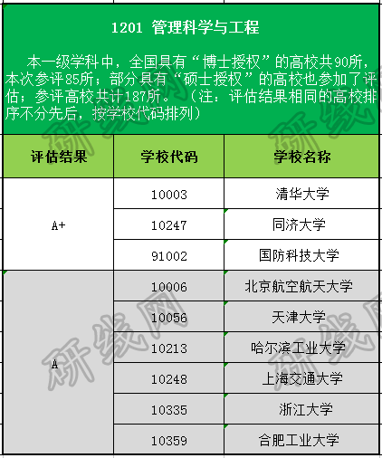 教育部學(xué)位與研究生教育發(fā)展中心于2017年12月28日公布全國第四輪學(xué)科評估結(jié)果,其中管理學(xué)類學(xué)科高校評估結(jié)果為A及A以上等級的學(xué)校名稱及代碼如下: