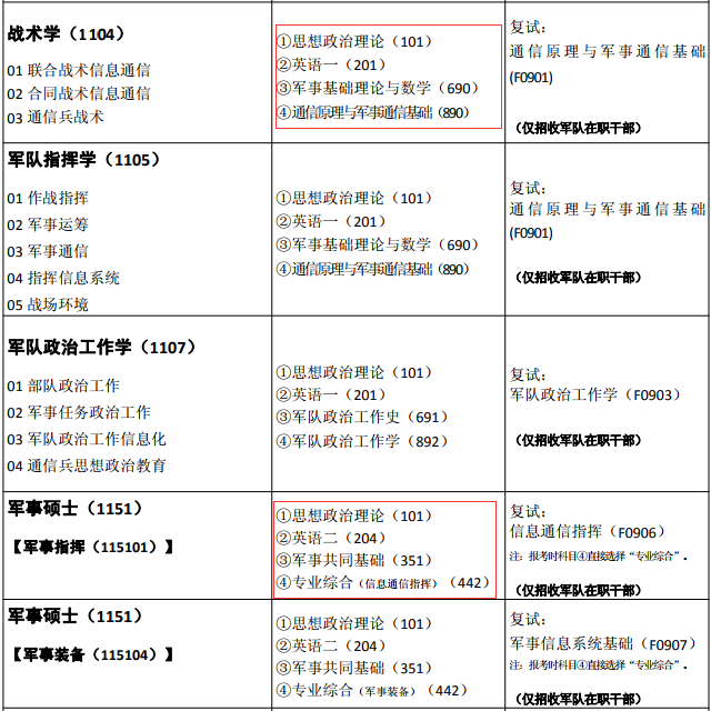軍事學的考試科目為政治、英語加兩門專業課,專業課基本上是招生單位自主命題,查看報考學校公布的碩士專業目錄即可了解初試科目。分數構成為政治滿分100分,英語滿分100分,專業課一滿分150分,專業課二滿分150分,總分為500分,以國防科技大學信息通信學院的戰術學(1104)為例: