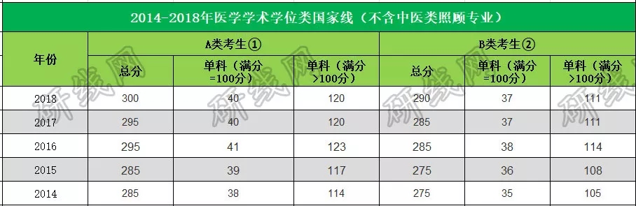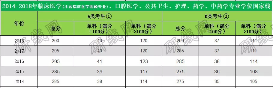 2014-2018年臨床醫學(不含臨床醫學照顧專業)、口腔醫學、公共衛生、護理、藥學、中藥學專業學位國家線: