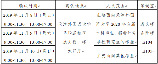 以上就是“天津外國語大學2020考研現場確認時間:11月8號-10號另附現場確認所需材料”的全部內容,請考生務必參加現場審核,祝你考研成功!