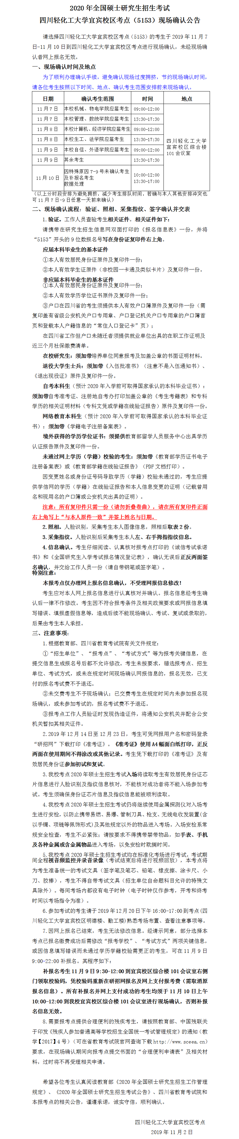 以上就是“2020考研現場確認時間:四川輕化工大學(宜賓校區)于11月7-10號現場確認另附所需材料”的全部內容!請考生務必參加現場審核,祝你考研成功。