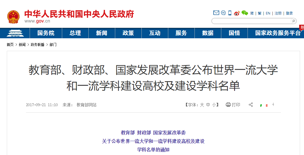 根據國務院《統籌推進世界一流大學和一流學科建設總體方案》以及教育部等三部委《統籌推進世界一流大學和一流學科建設實施辦法(暫行)》,經專家委員會遴選認定,教育部、財政部、國家發展改革委研究并報國務院批準,現公布世界一流大學和一流學科(簡稱“雙一流”)建設高校及建設學科名單。