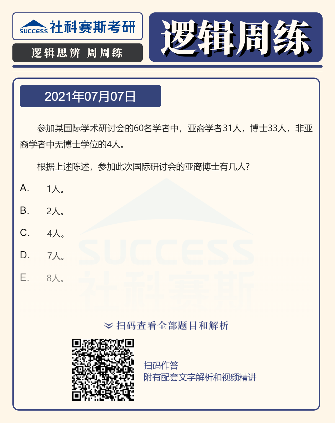 以上就是社科賽斯考研網(wǎng)小編為大家整理邏輯專項練習(xí):7月7日邏輯專項練習(xí)及答案的全部內(nèi)容,希望各位考生堅持利用起來,想要獲取更多內(nèi)容請持續(xù)關(guān)注社科賽斯考研網(wǎng)。
