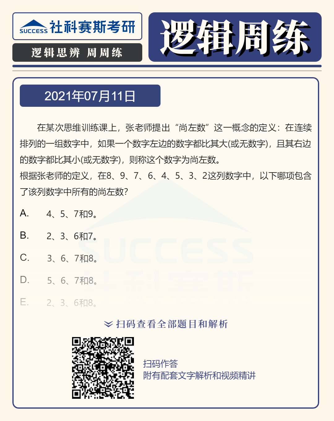 以上就是社科賽斯考研網小編為大家整理邏輯專項練習:7月11日邏輯專項練習及答案的全部內容,希望各位考生堅持利用起來,想要獲取更多內容請持續關注社科賽斯考研網。