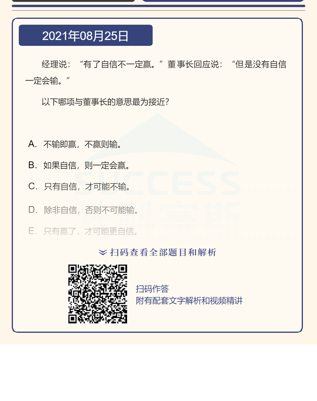 以上就是社科賽斯考研網小編為大家整理邏輯專項練習:8月25日邏輯專項練習及答案的全部內容,希望各位考生堅持利用起來,想要獲取更多內容請持續關注社科賽斯考研網。