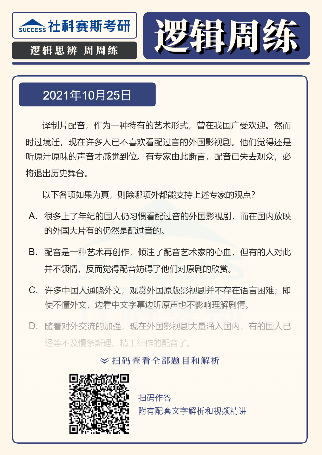 以上就是社科賽斯考研網小編為大家整理邏輯專項練習:10月25日邏輯專項練習及答案的全部內容,希望各位考生堅持利用起來,想要獲取更多內容請持續關注社科賽斯考研網。