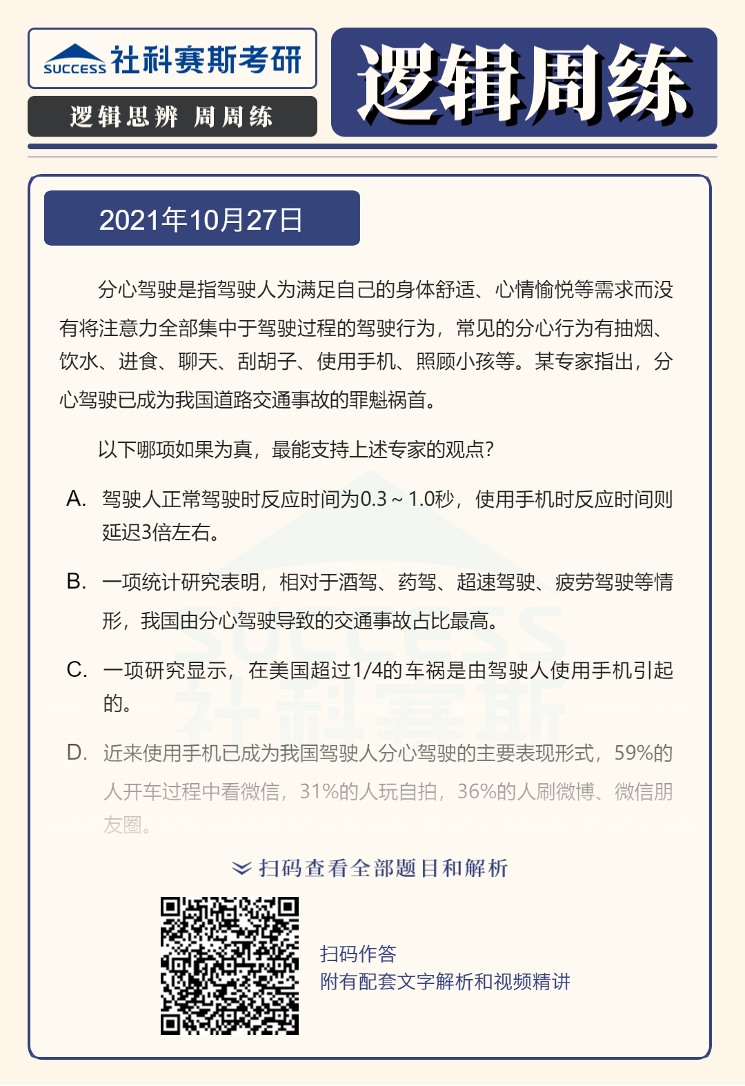 以上就是社科賽斯考研網小編為大家整理邏輯專項練習:10月27日邏輯專項練習及答案的全部內容,希望各位考生堅持利用起來,想要獲取更多內容請持續關注社科賽斯考研網。