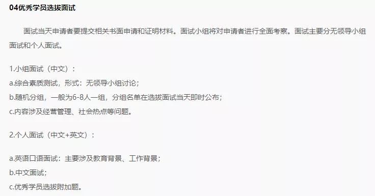(3)綜合素質,面試環節最重要且最難的當屬綜合素質,綜合素質面試包括個人面試(15-25分鐘)和小組面試(30-40分鐘),個人面試為主。個人面試包括自我簡介、互動提問、管理知識三個環節。