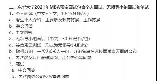不同的學校略有不同,例如上海外國語大學MBA預復試由管理案例分析、個人中文面試、英語測試(僅限報考全日制英文MBA、非全日制英文MBA的考生參加)三個環節構成。