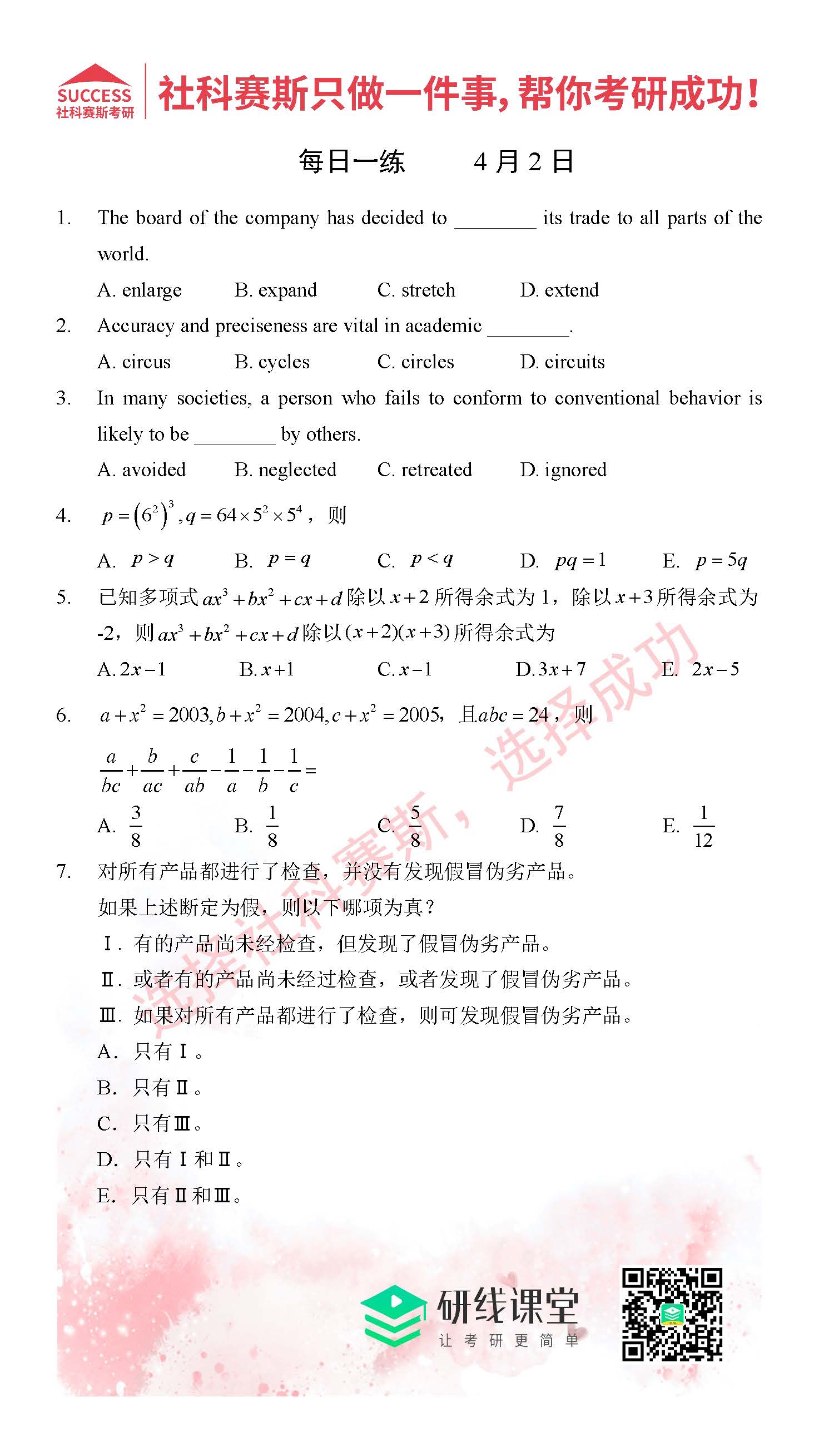 考研是一場持久戰(zhàn),保持良好的學(xué)習(xí)習(xí)慣,是能確保復(fù)習(xí)高效的關(guān)鍵。MBA備考網(wǎng)小編整理了管綜的每日一練,希望能對(duì)廣大考生有所幫助。