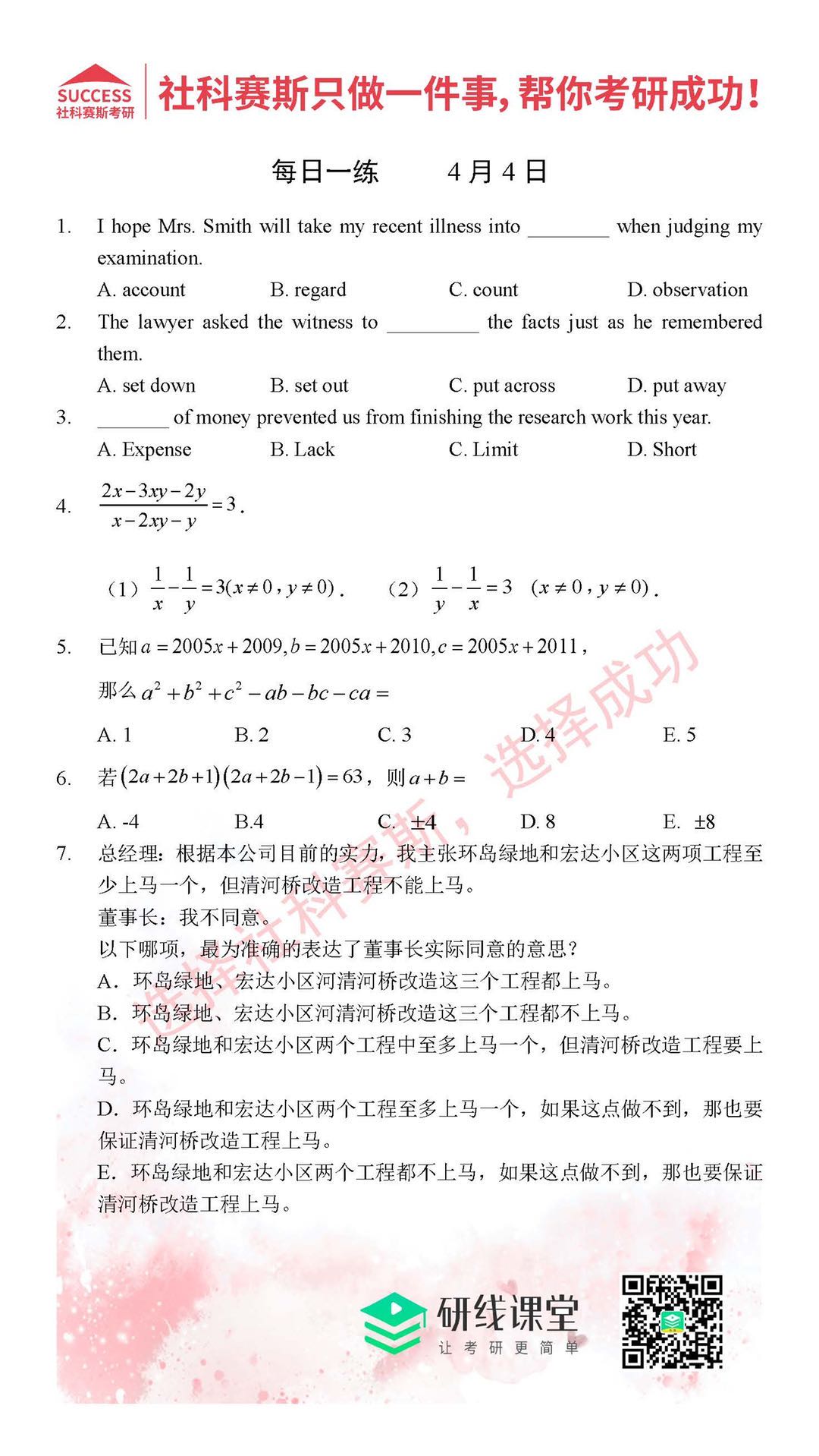考研是一場持久戰,保持良好的學習習慣,是能確保復習高效的關鍵。MBA備考網小編整理了管綜的每日一練,希望能對廣大考生有所幫助。