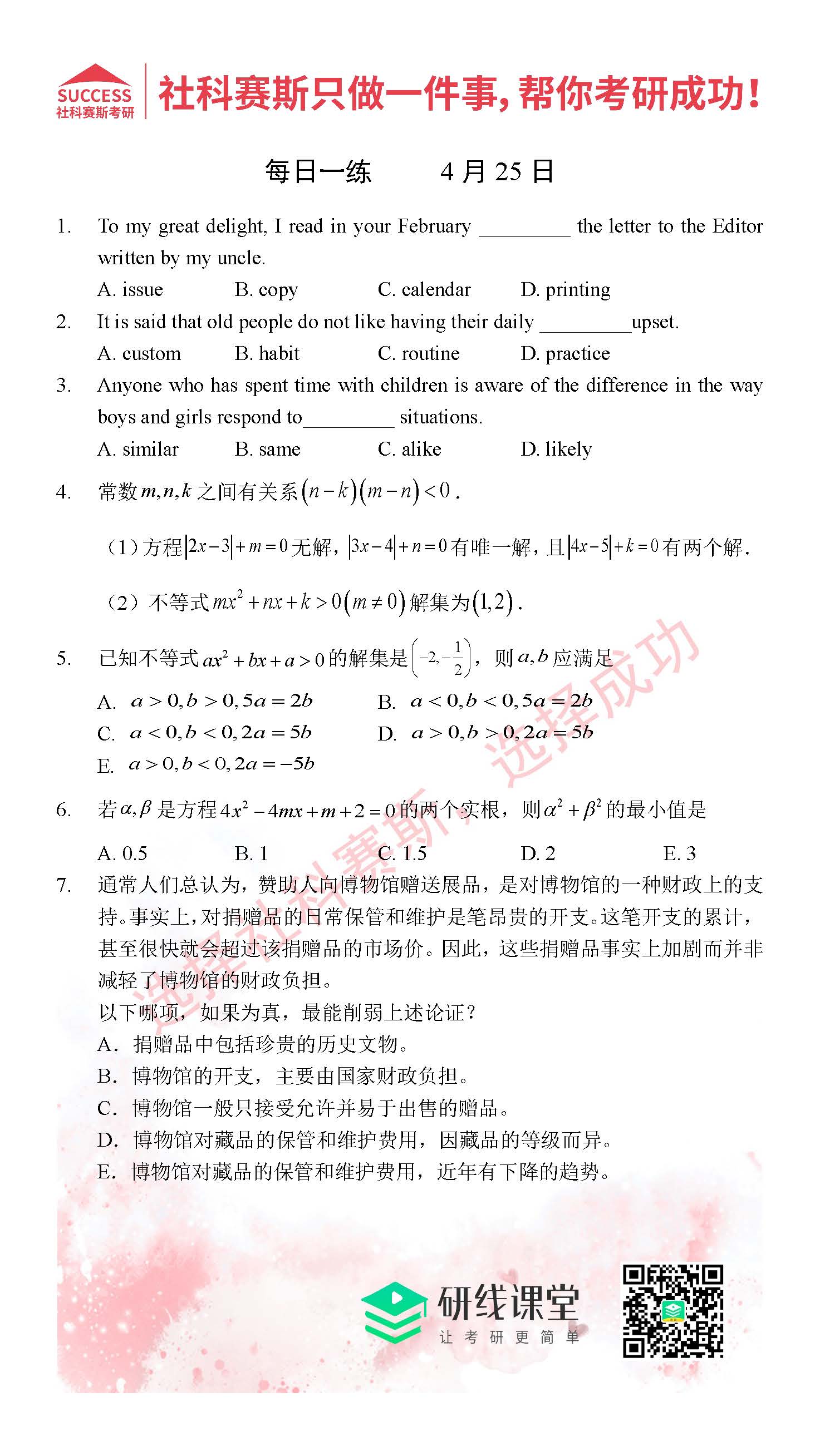 考研是一場持久戰,保持良好的學習習慣,是能確保復習高效的關鍵。MBA備考網小編整理了管綜的每日一練,希望能對廣大考生有所幫助。