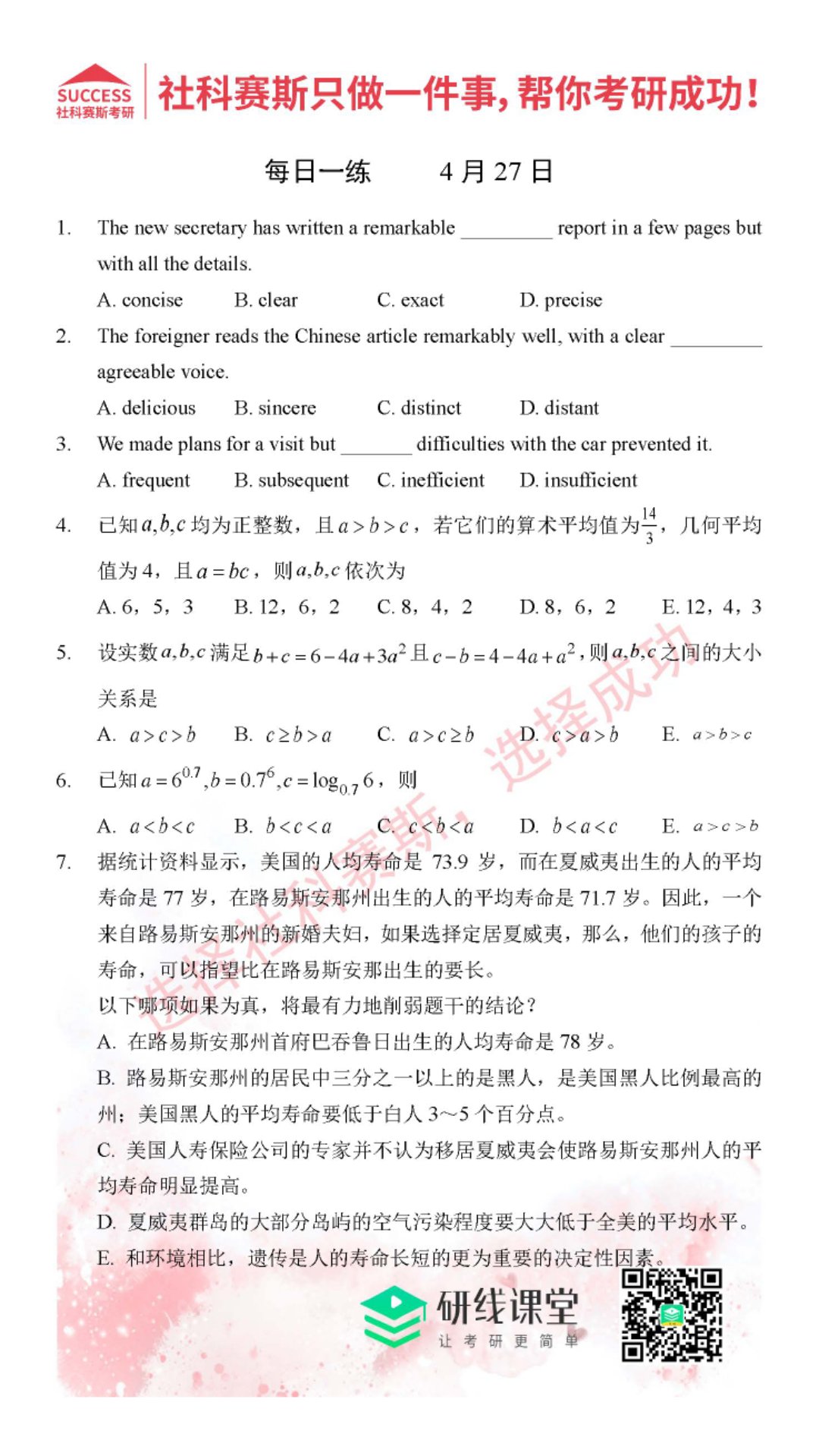 考研是一場持久戰,保持良好的學習習慣,是能確保復習高效的關鍵。MBA備考網小編整理了管綜的每日一練,希望能對廣大考生有所幫助。