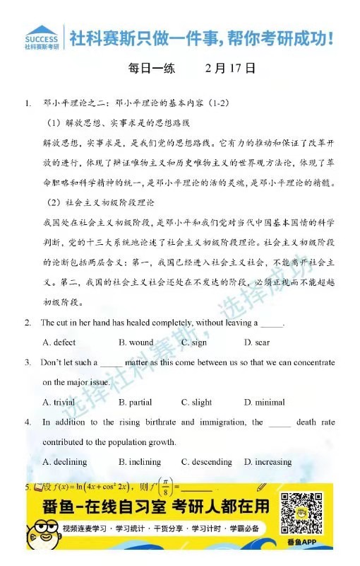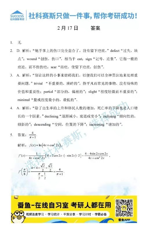 考研是一場持久戰(zhàn),保持良好的學(xué)習(xí)習(xí)慣,是能確保復(fù)習(xí)高效的關(guān)鍵。今天社科賽斯考研網(wǎng)小編整理了“2022考研每日一練:2月17日每日一練及答案”的內(nèi)容,希望能對廣大考生有所幫助。