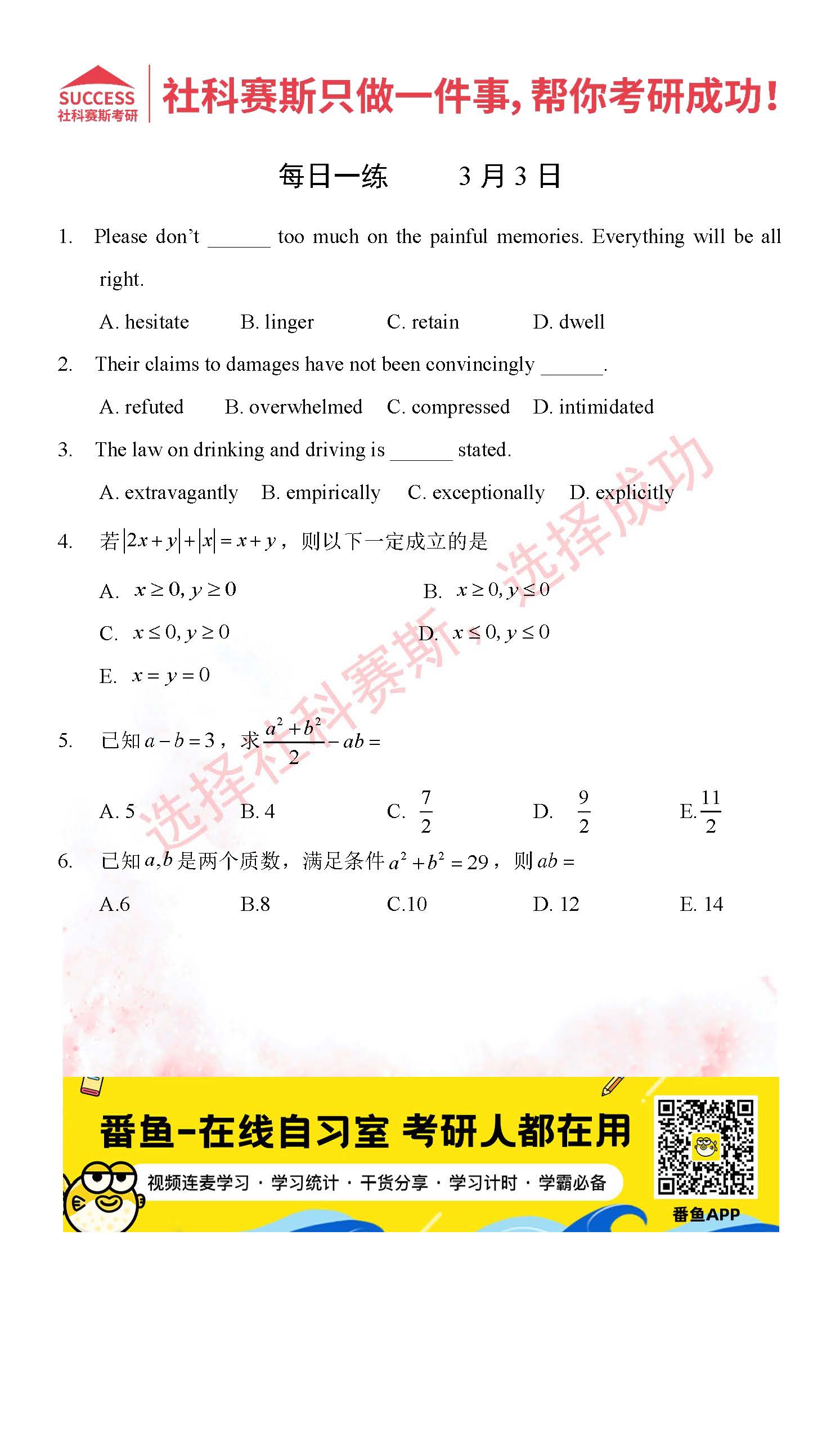 考研是一場持久戰,保持良好的學習習慣,是能確保復習高效的關鍵。今天社科賽斯考研網小編整理了“2022考研每日一練:3月3日管理類聯考每日一練及答案”的內容,希望能對廣大考生有所幫助。