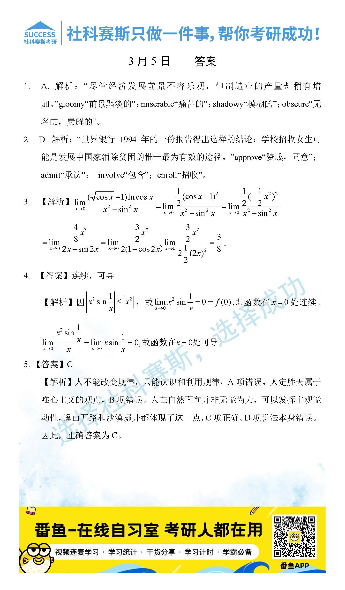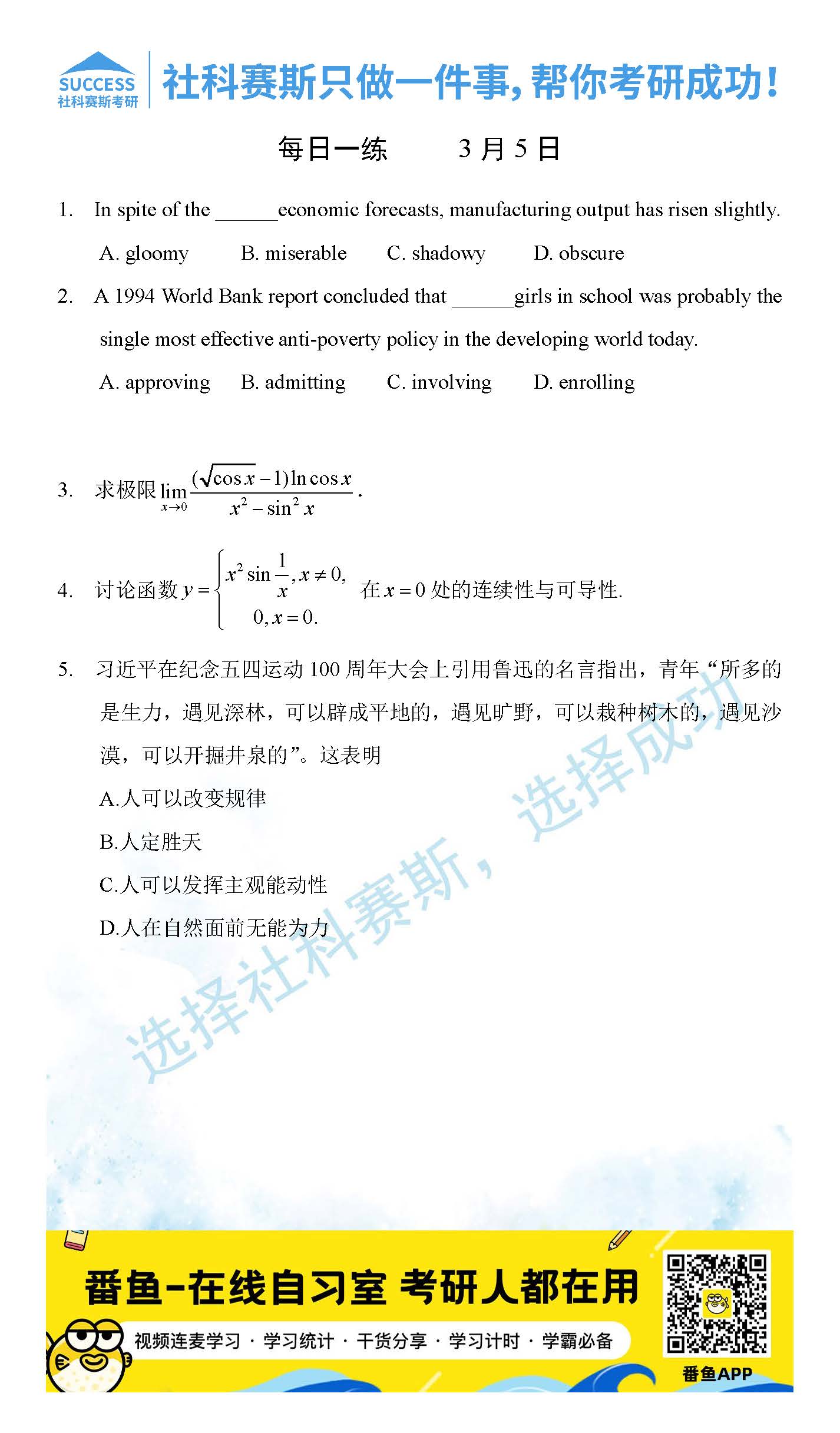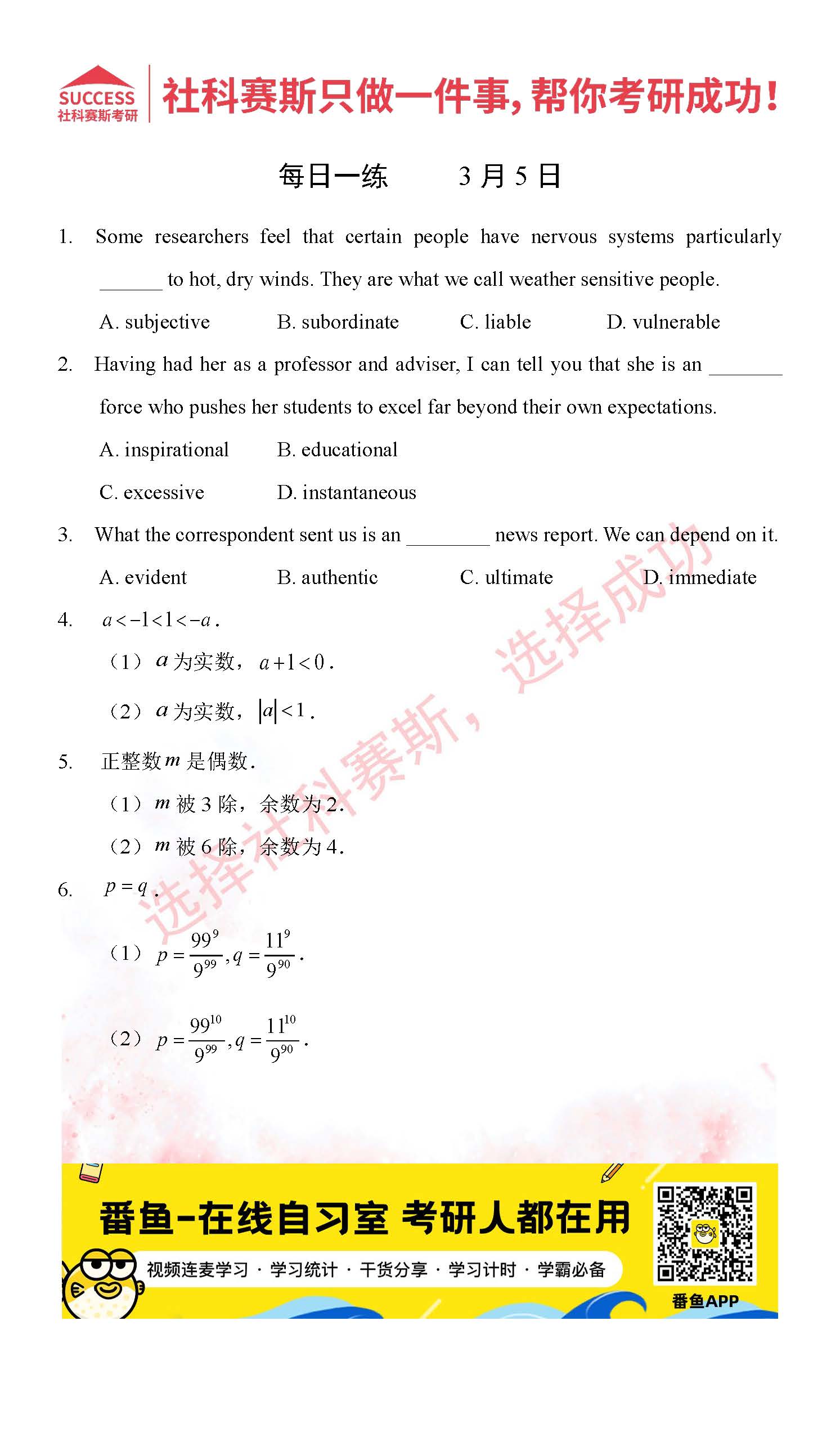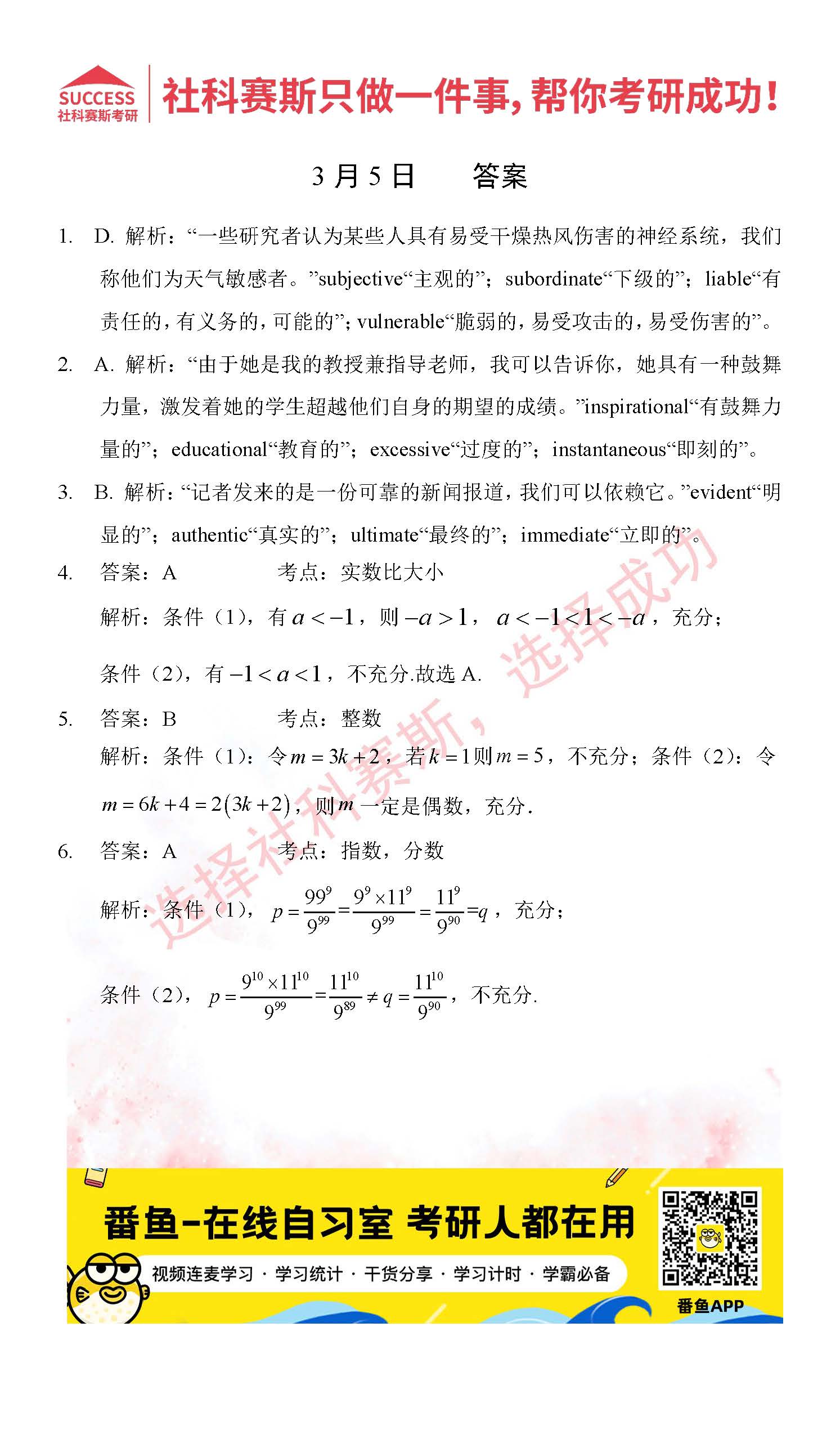 以上就是社科賽斯考研網小編為大家整理2022考研每日一練:3月5日管理類聯考每日一練及答案的全部內容,希望各位考生堅持利用起來,更多每日一練內容請持續關注社科賽斯考研網