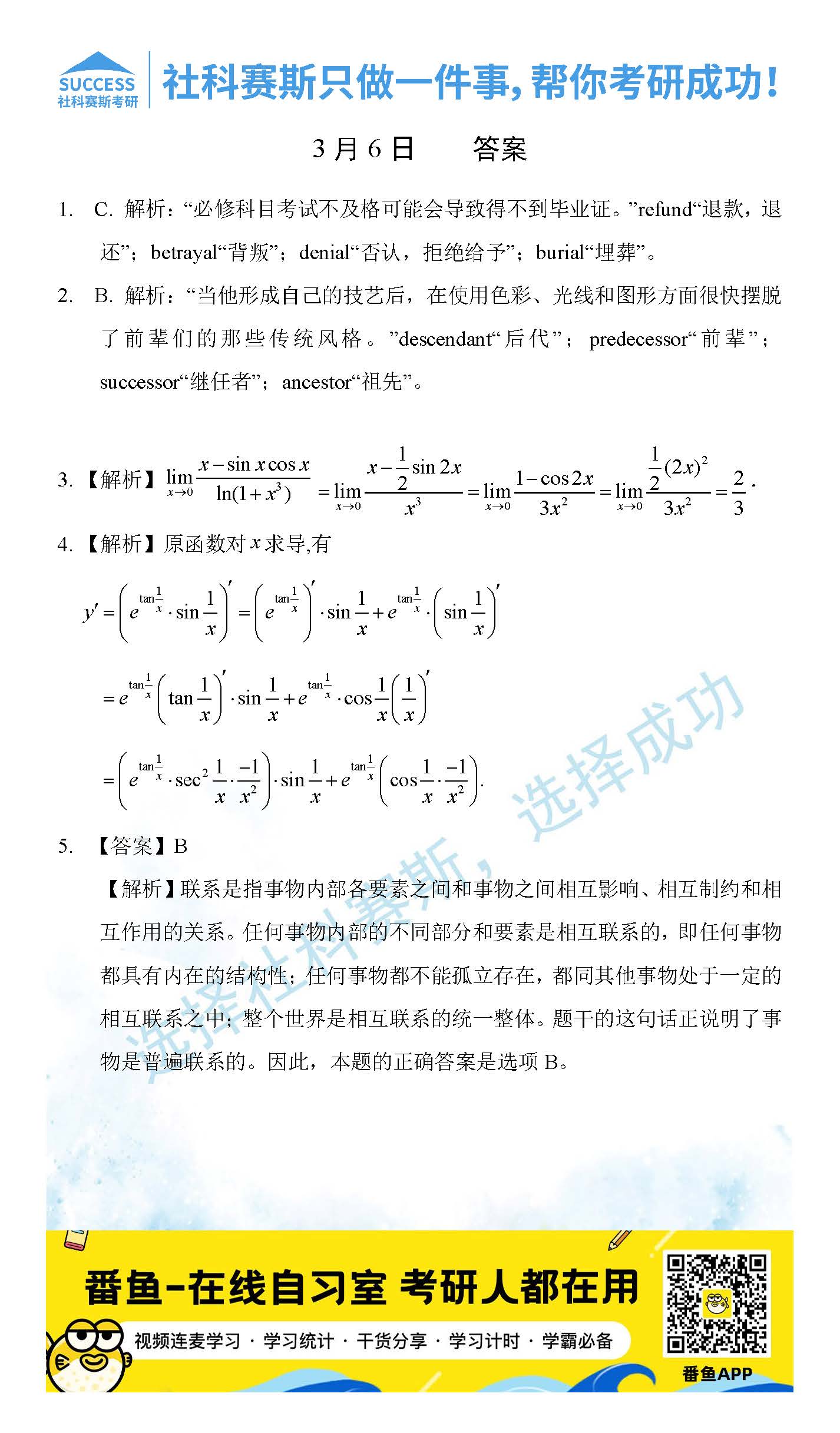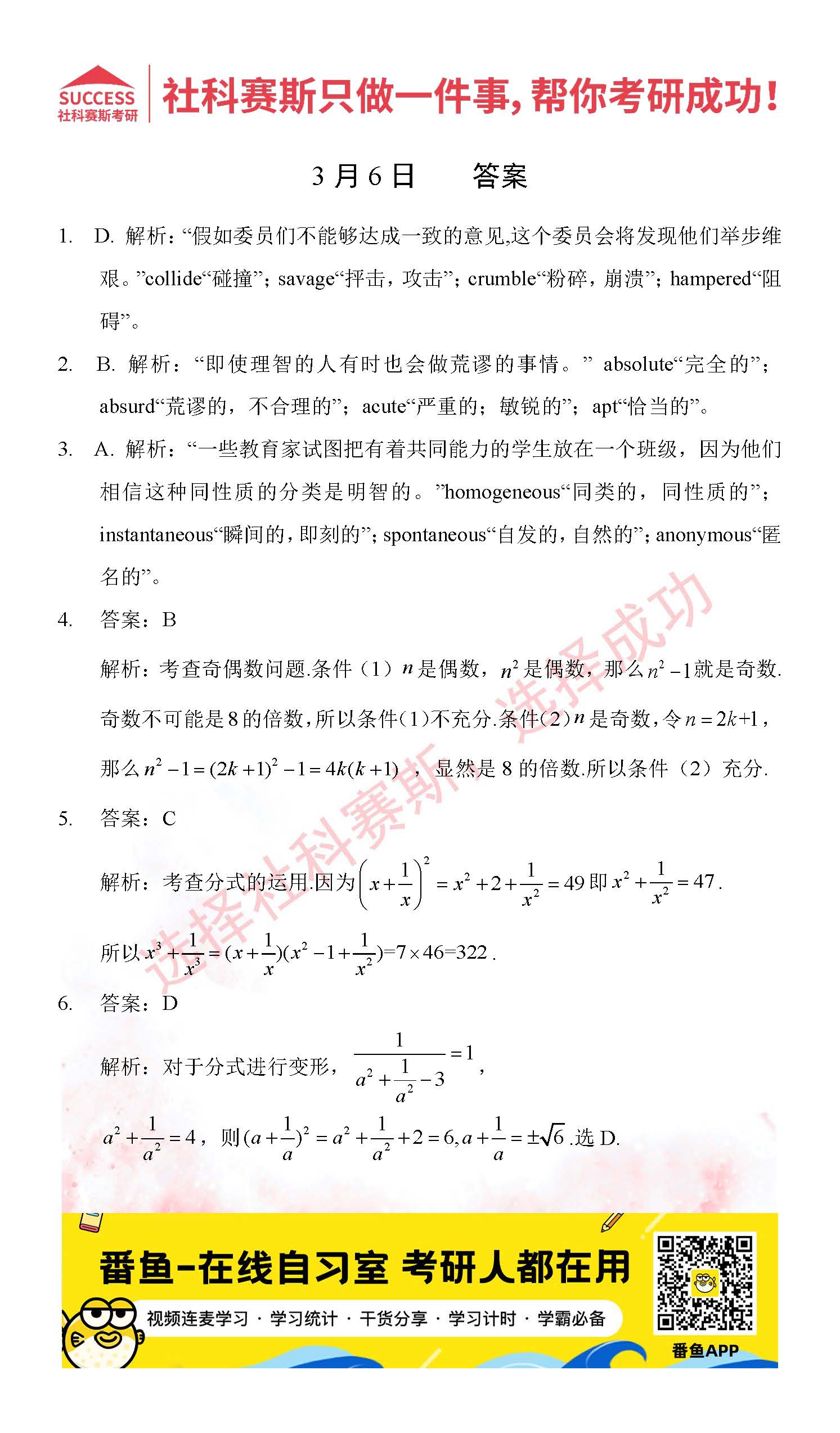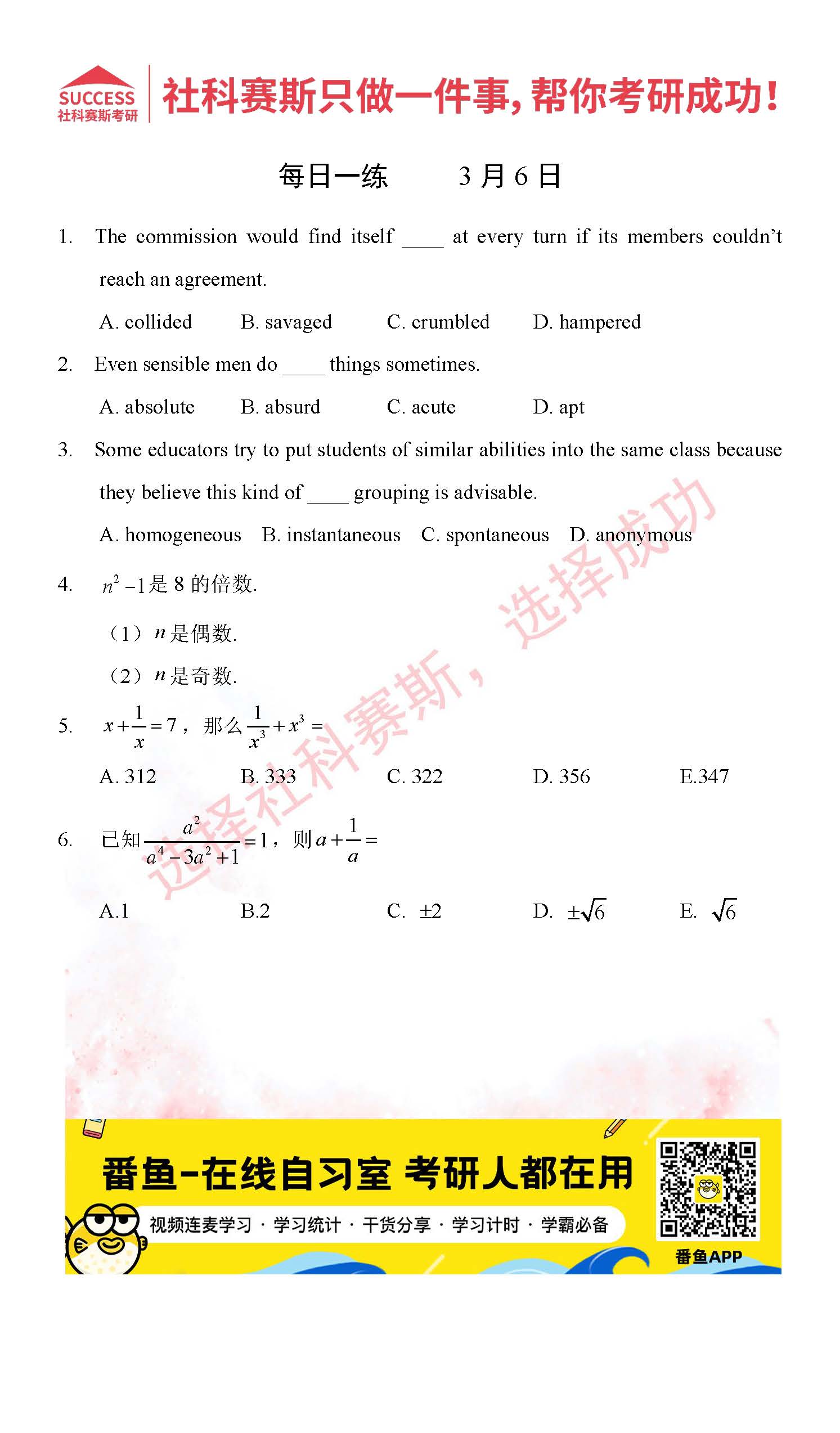以上就是社科賽斯考研網小編為大家整理2022考研每日一練:3月6日管理類聯考每日一練及答案的全部內容,希望各位考生堅持利用起來,更多每日一練內容請持續關注社科賽斯考研網。