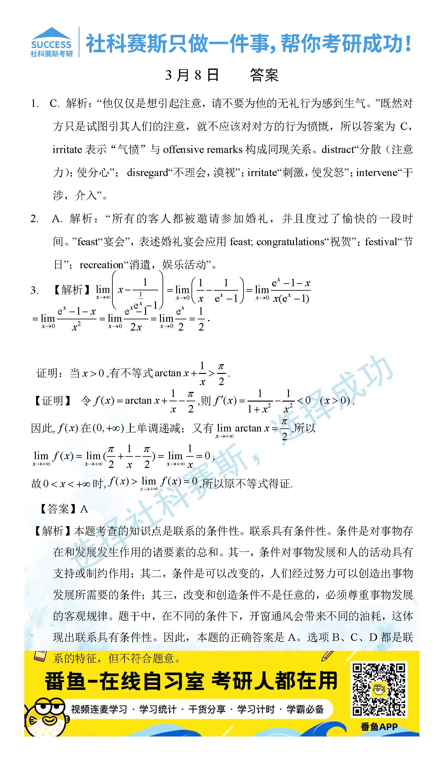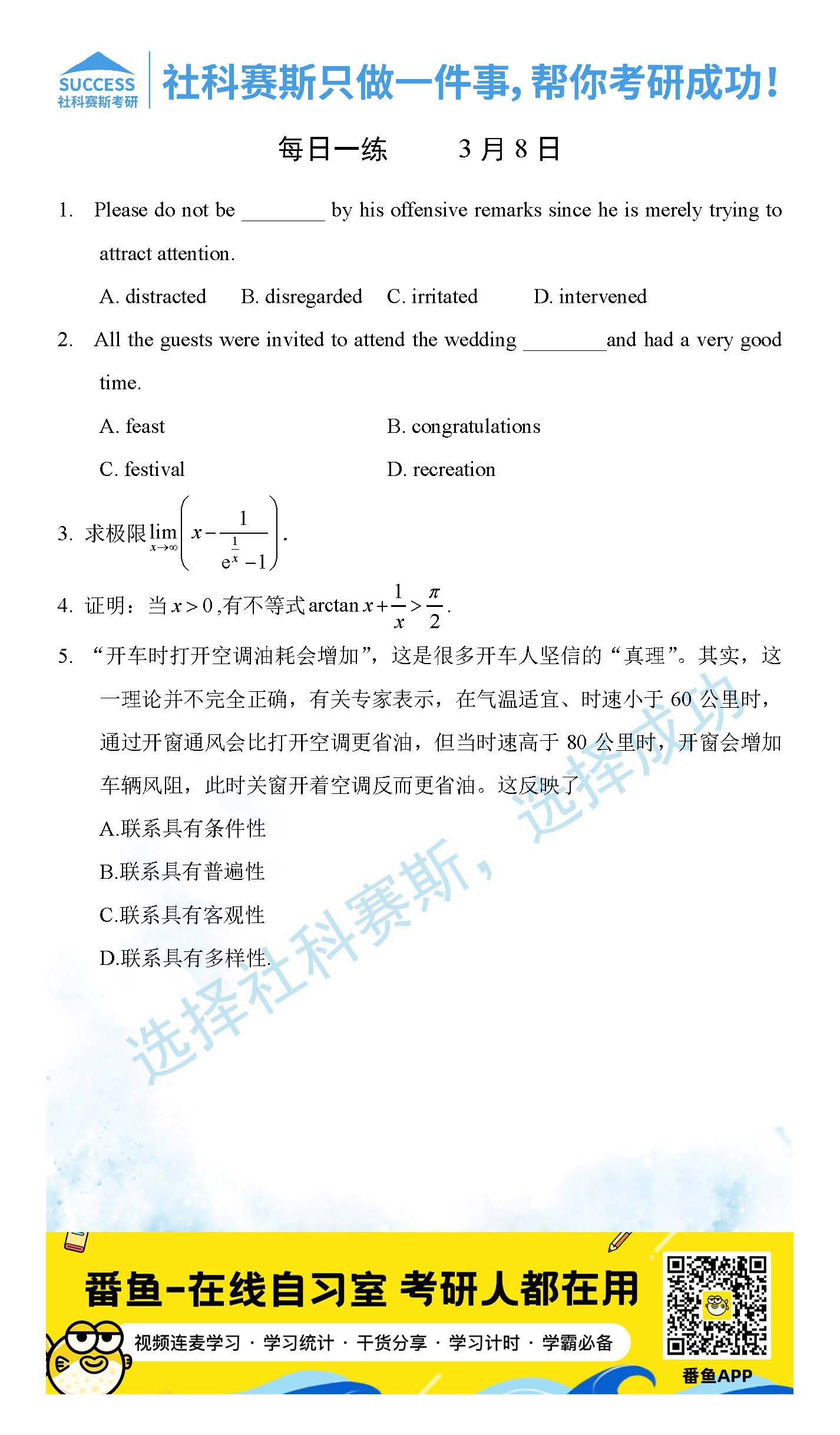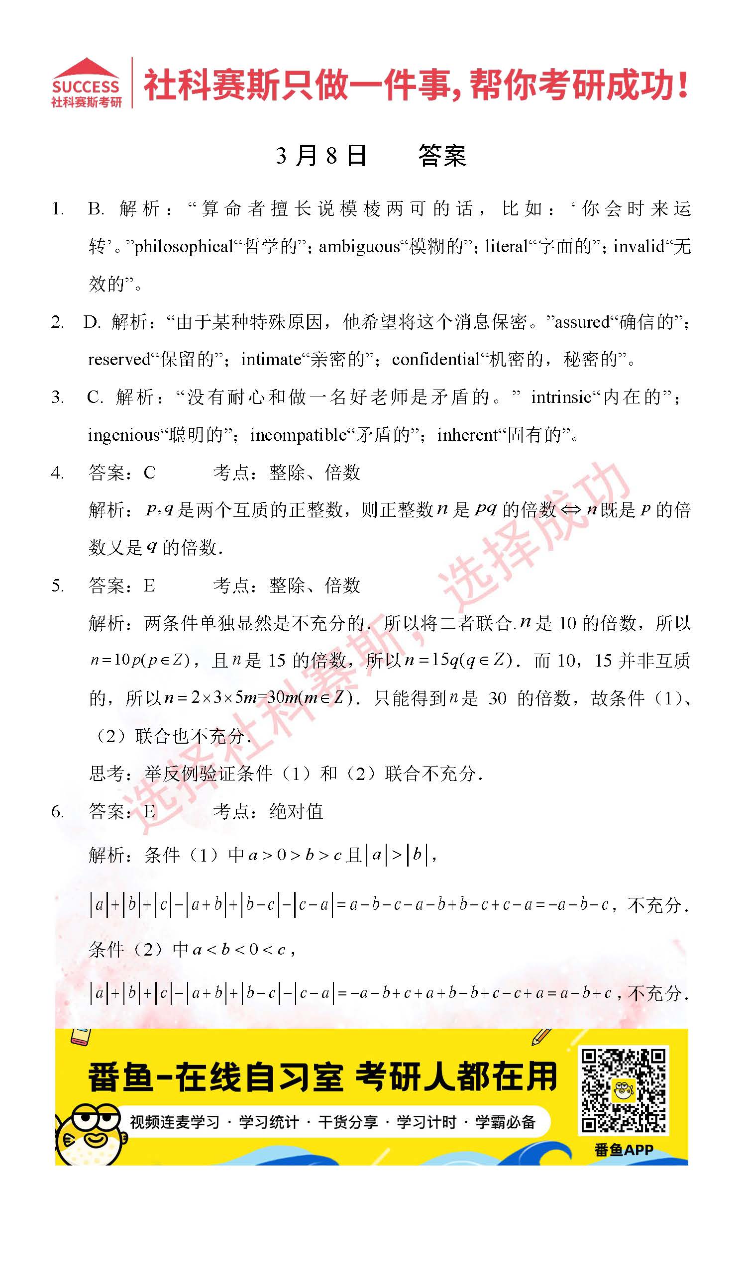 以上就是社科賽斯考研網(wǎng)小編為大家整理2022考研每日一練:3月8日管理類聯(lián)考每日一練及答案的全部?jī)?nèi)容,希望各位考生堅(jiān)持利用起來(lái),更多每日一練內(nèi)容請(qǐng)持續(xù)關(guān)注社科賽斯考研網(wǎng)