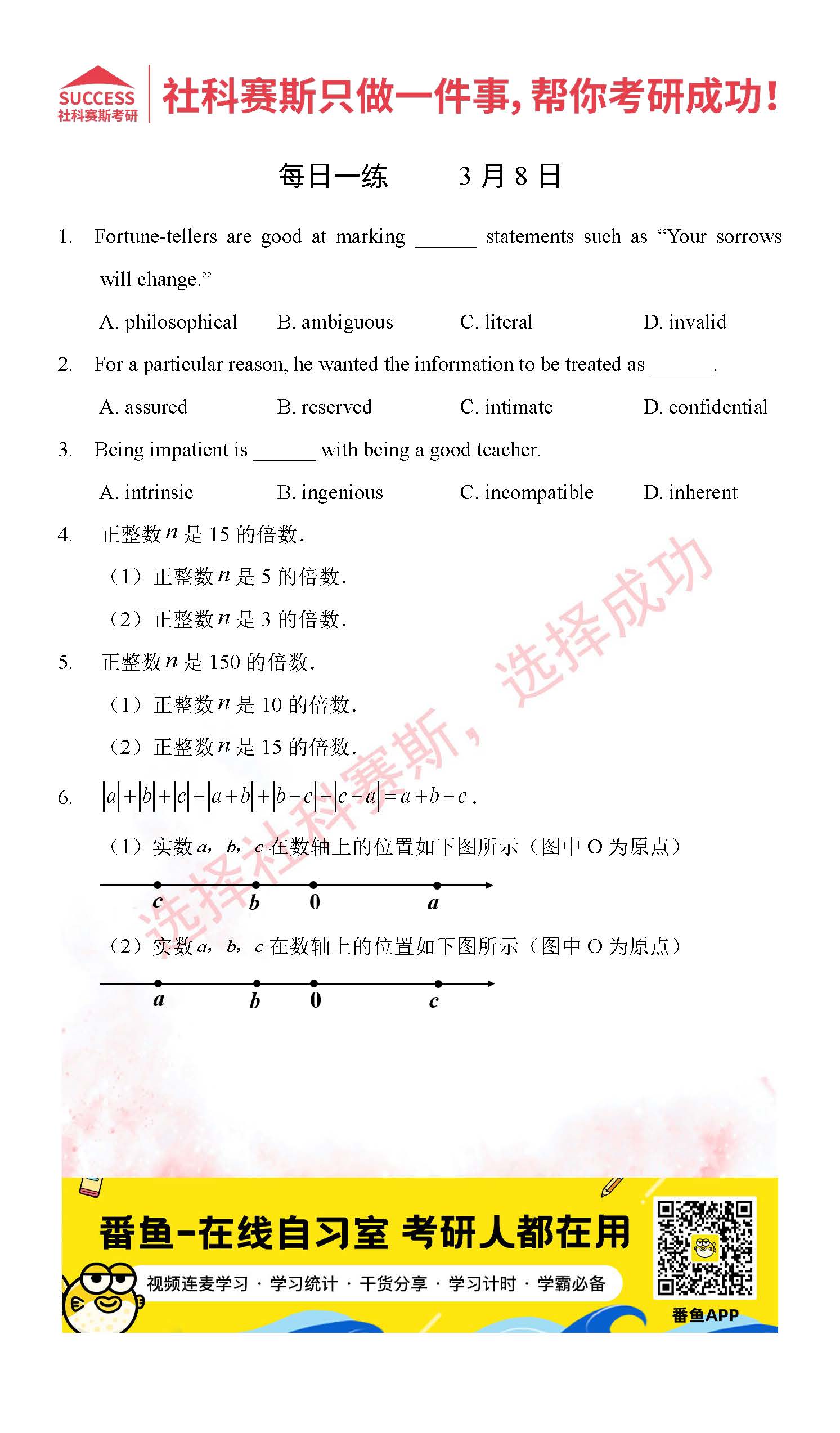 考研是一場(chǎng)持久戰(zhàn),保持良好的學(xué)習(xí)習(xí)慣,是能確保復(fù)習(xí)高效的關(guān)鍵。今天社科賽斯考研網(wǎng)小編整理了“2022考研每日一練:3月8日管理類聯(lián)考每日一練及答案”的內(nèi)容,希望能對(duì)廣大考生有所幫助。