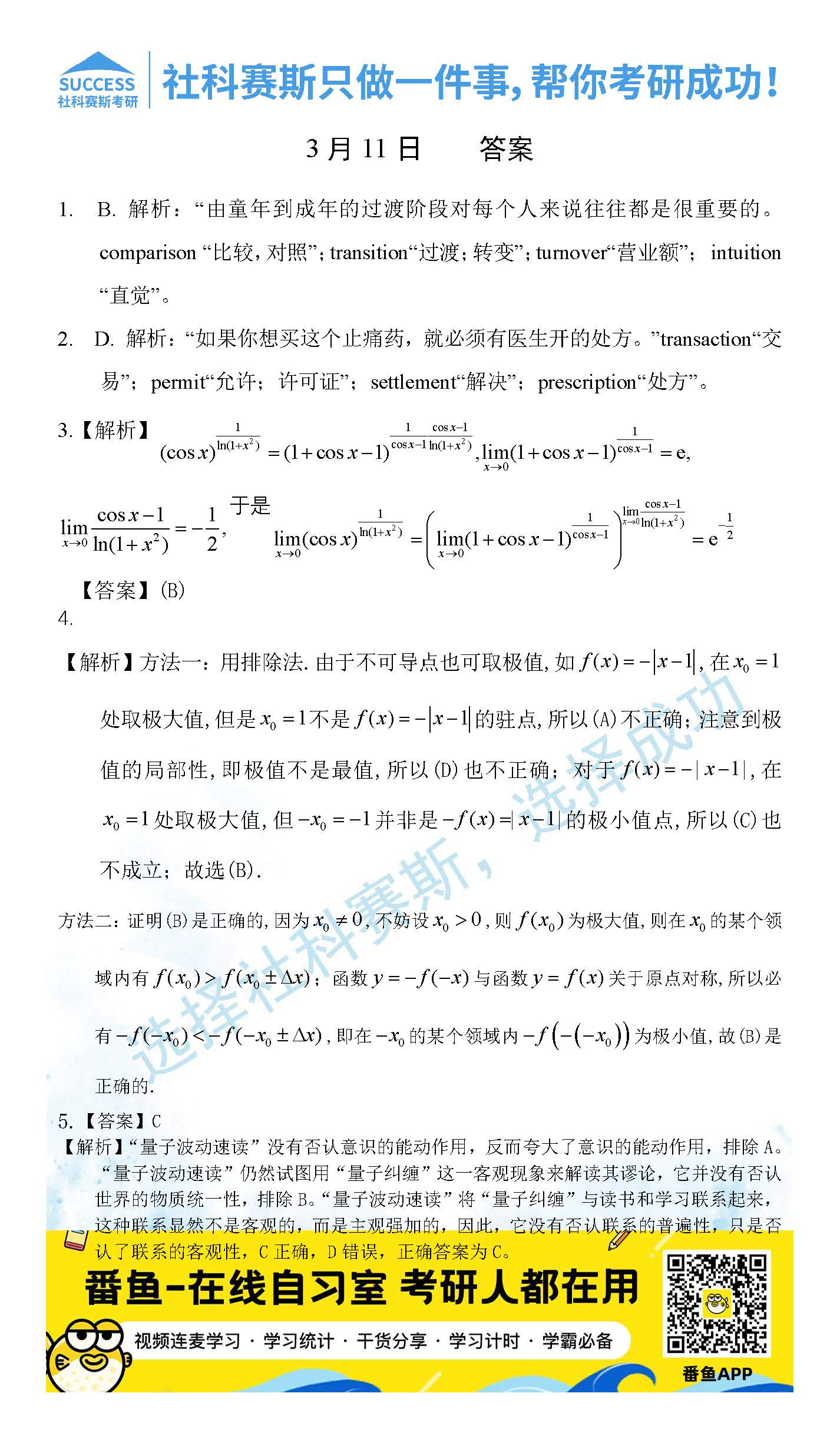 以上就是社科賽斯考研網小編為大家整理2022考研每日一練:3月11日管理類聯考每日一練及答案的全部內容,希望各位考生堅持利用起來,更多每日一練內容請持續關注社科賽斯考研網