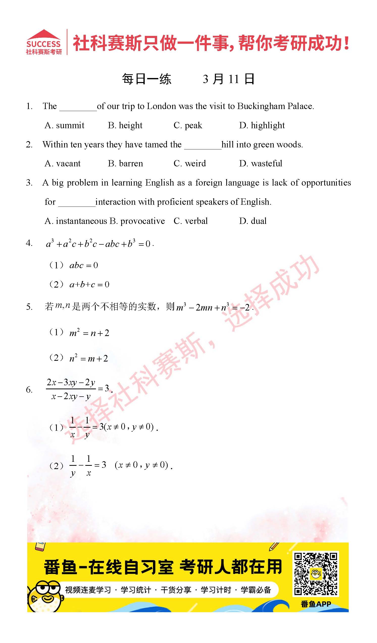 考研是一場持久戰,保持良好的學習習慣,是能確保復習高效的關鍵。今天社科賽斯考研網小編整理了“2022考研每日一練:3月11日管理類聯考每日一練及答案”的內容,希望能對廣大考生有所幫助。