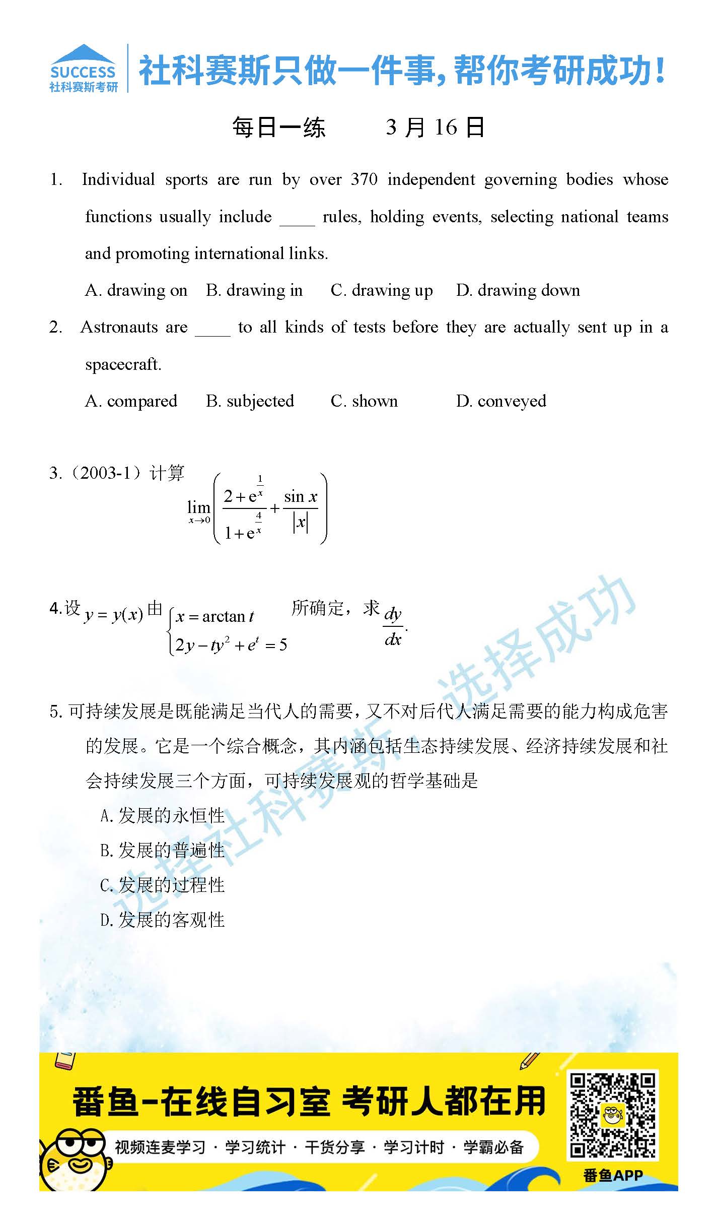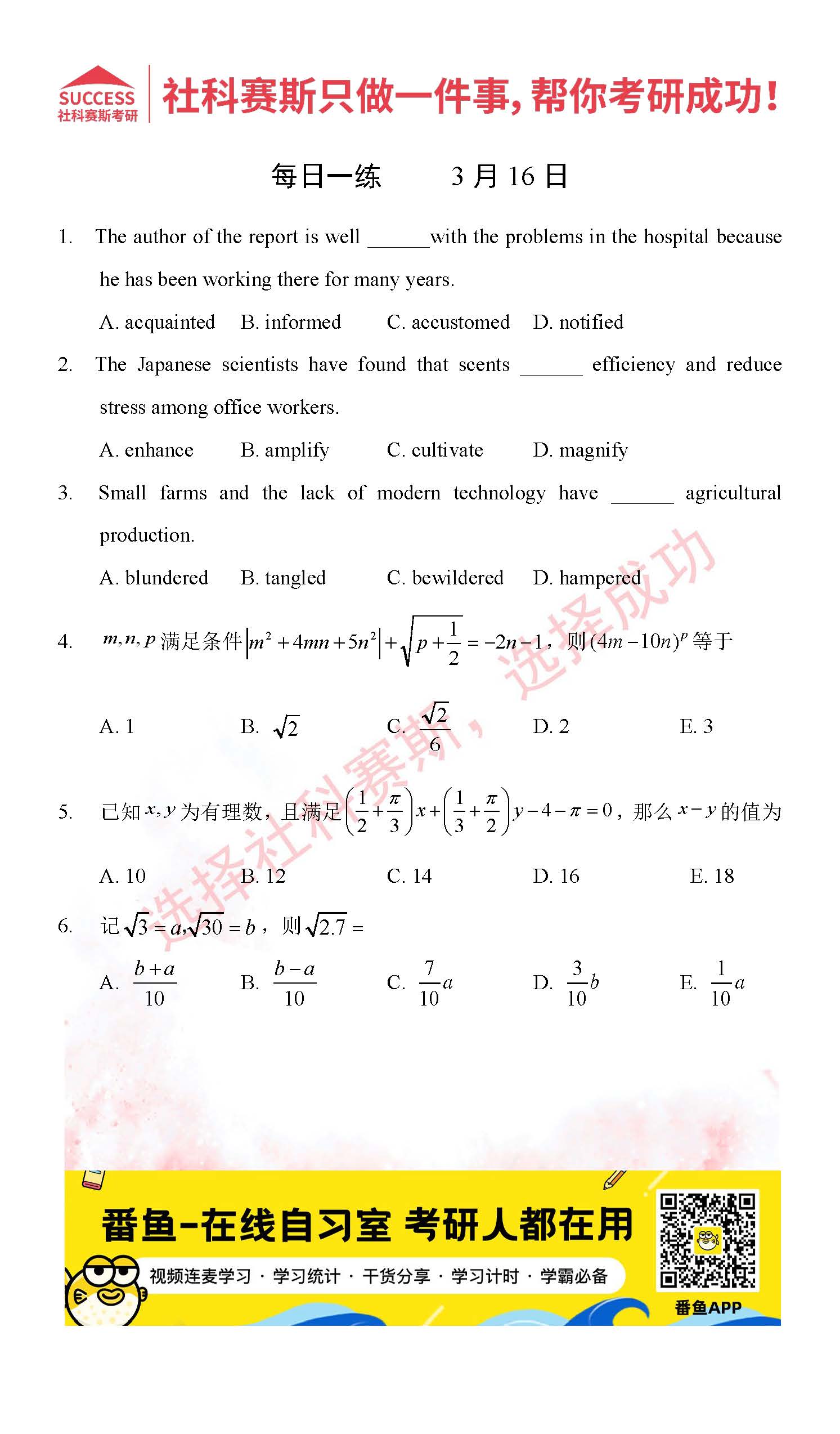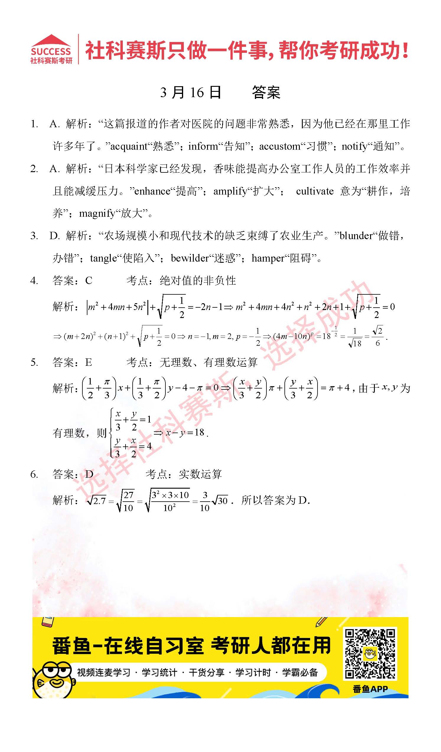 以上就是社科賽斯考研網小編為大家整理2022考研每日一練:3月16日管理類聯考每日一練及答案的全部內容,希望各位考生堅持利用起來,更多每日一練內容請持續關注社科賽斯考研網