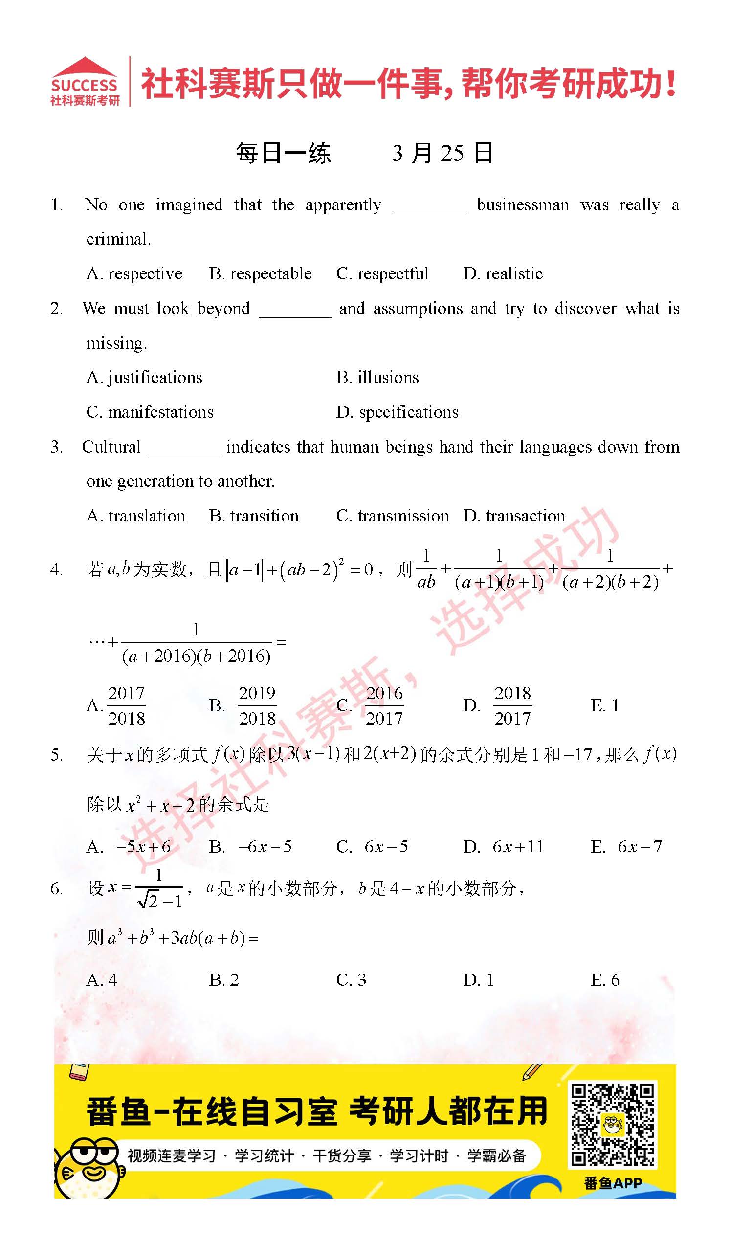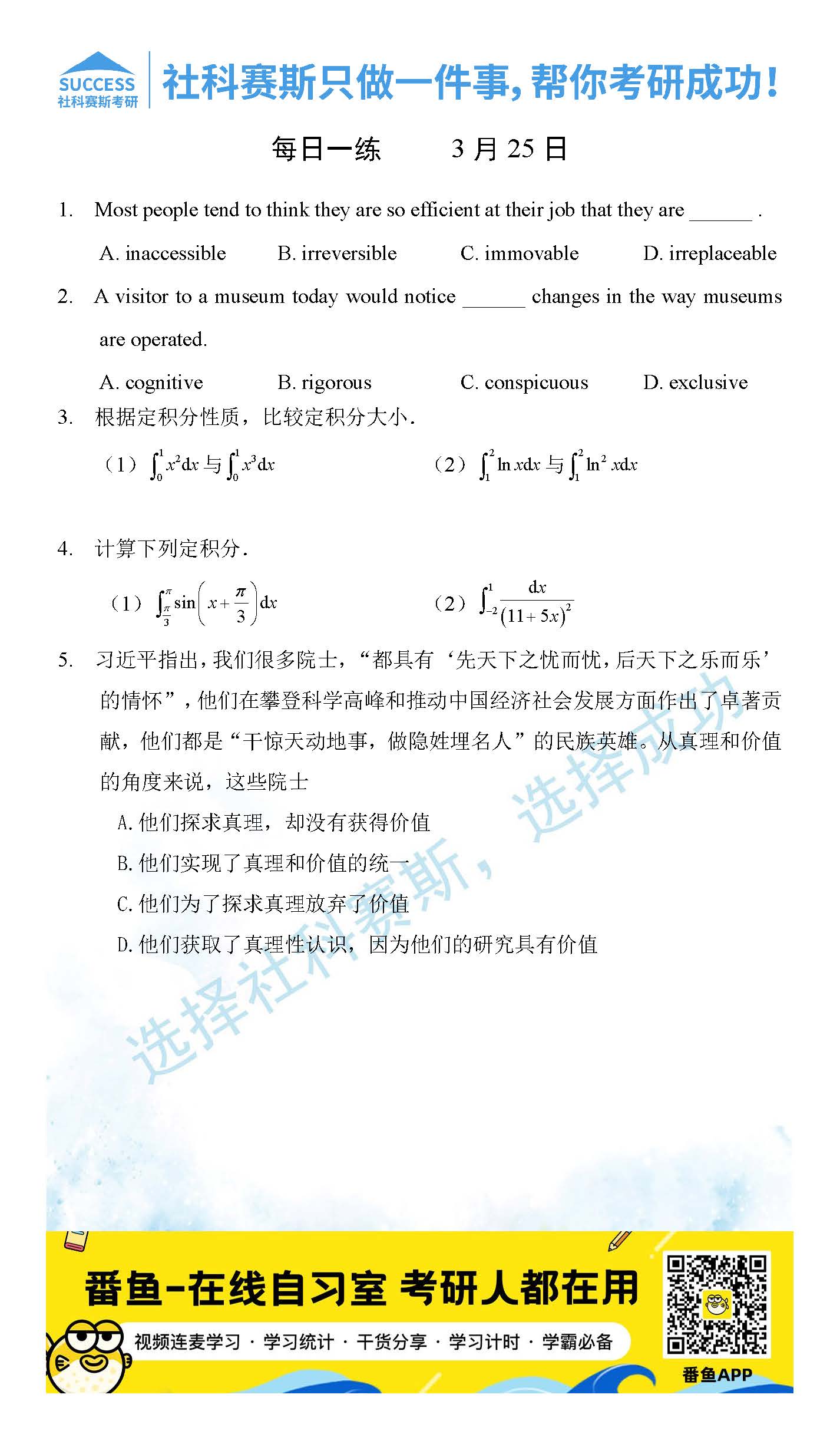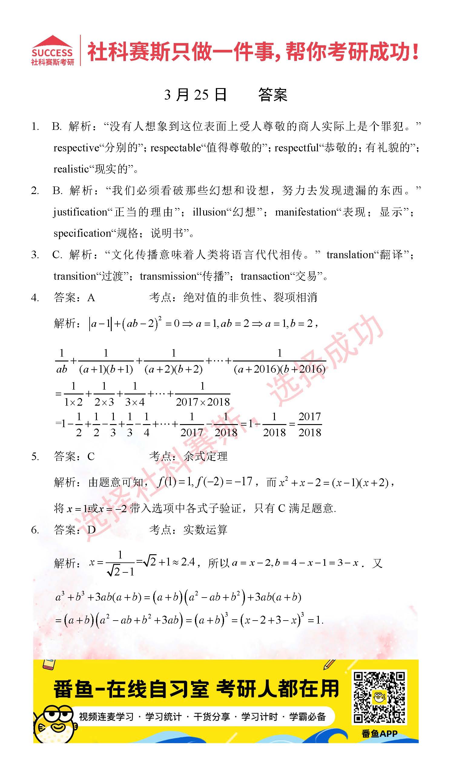 ?以上就是社科賽斯考研網小編為大家整理2022考研每日一練:3月25日管理類聯考每日一練及答案的全部內容,希望各位考生堅持利用起來,更多每日一練內容請持續關注社科賽斯考研網