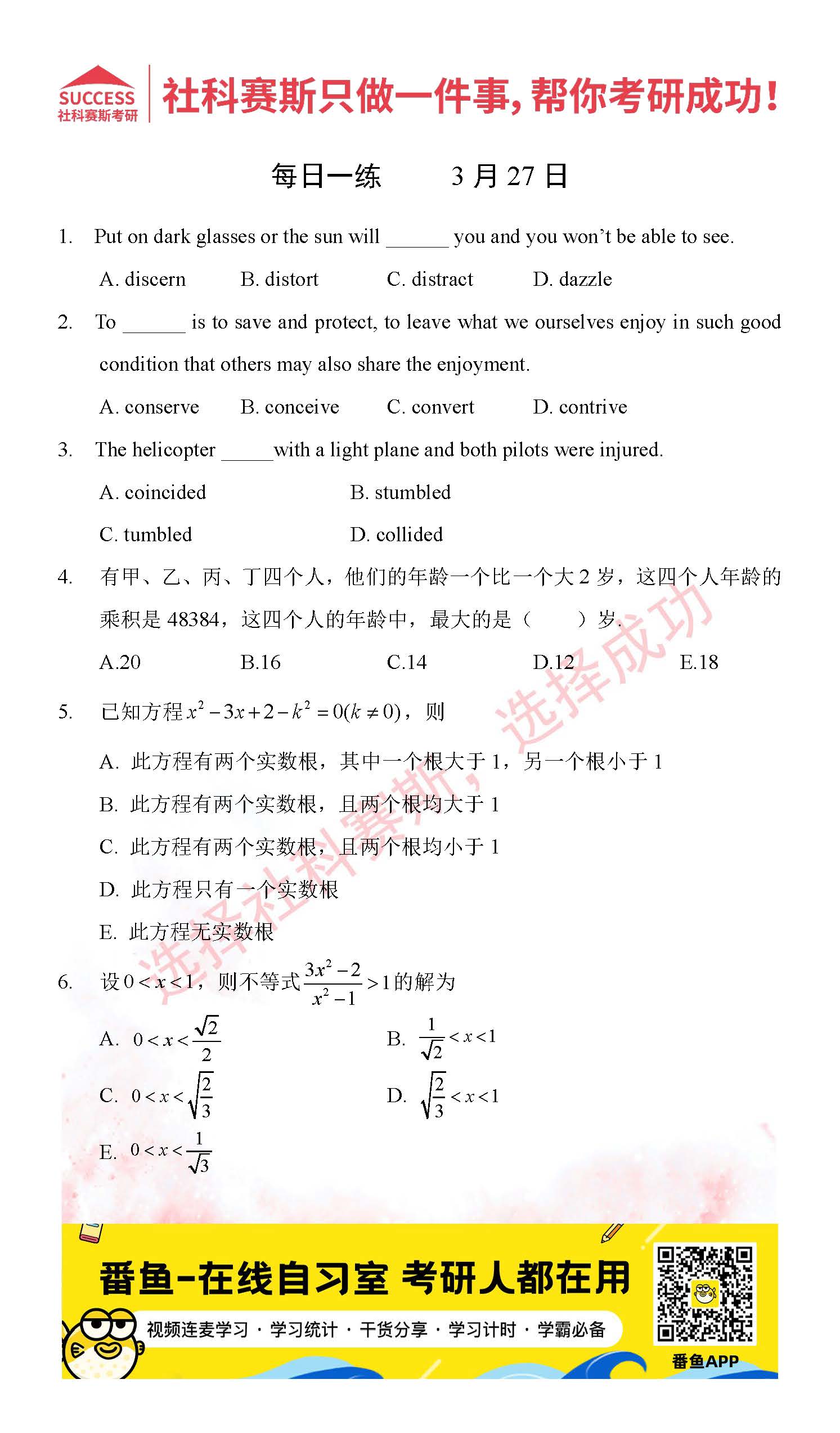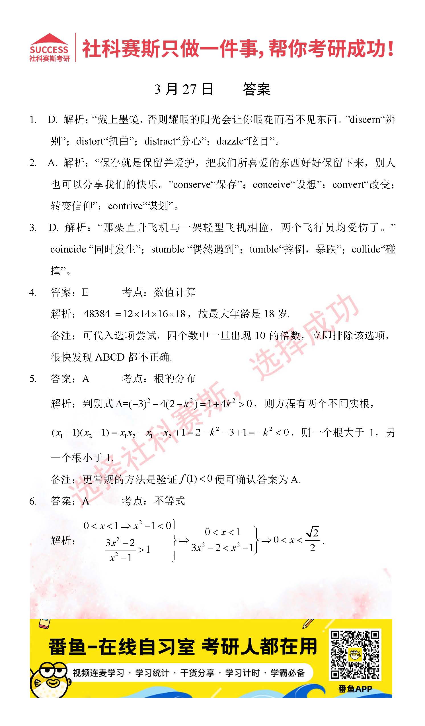 ?以上就是社科賽斯考研網小編為大家整理2022考研每日一練:3月27日管理類聯考每日一練及答案的全部內容,希望各位考生堅持利用起來,更多每日一練內容請持續關注社科賽斯考研網