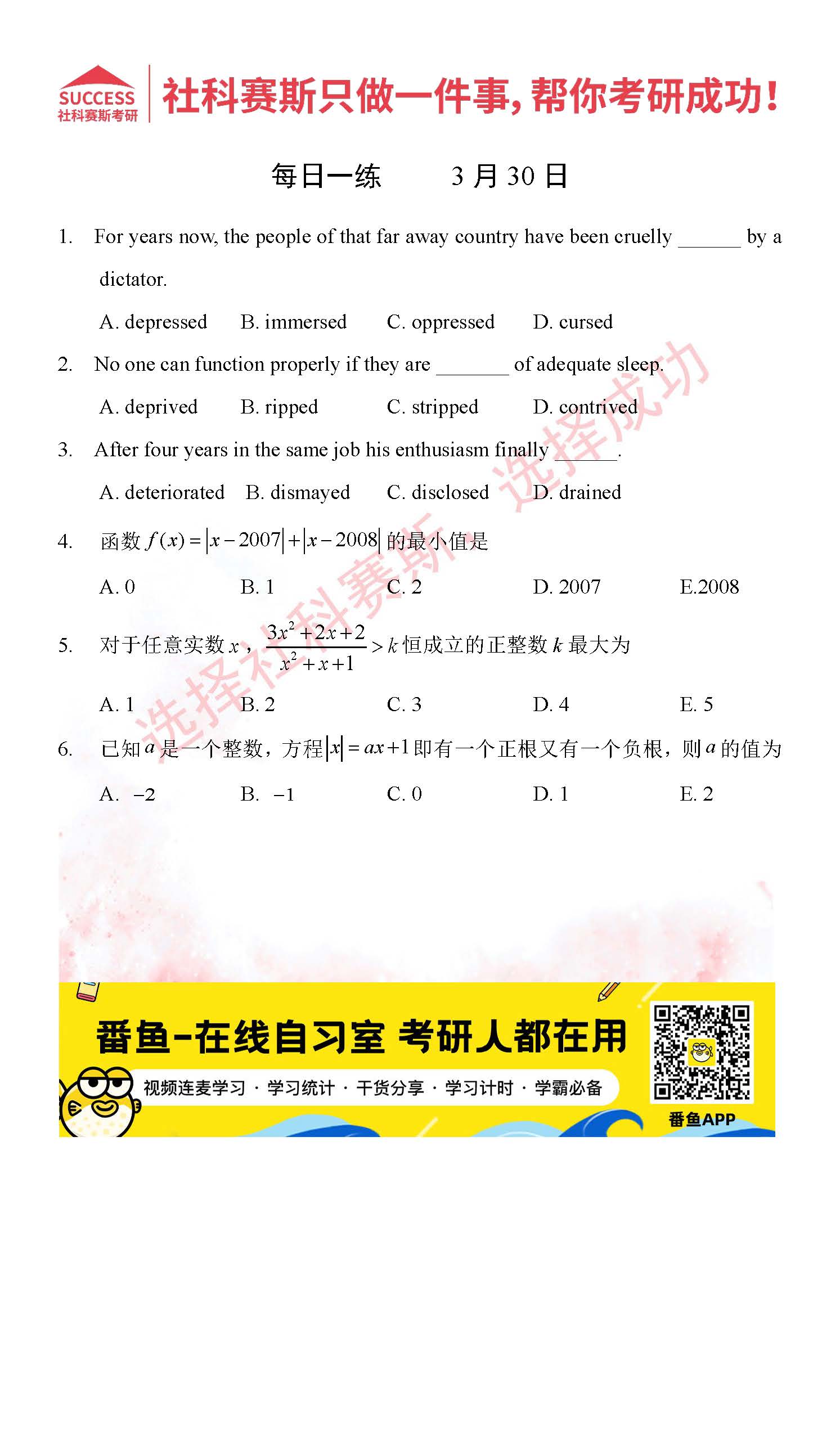 考研是一場持久戰,保持良好的學習習慣,是能確保復習高效的關鍵。今天社科賽斯考研網小編整理了“2022考研每日一練:3月30日管理類聯考每日一練及答案”的內容,希望能對廣大考生有所幫助。