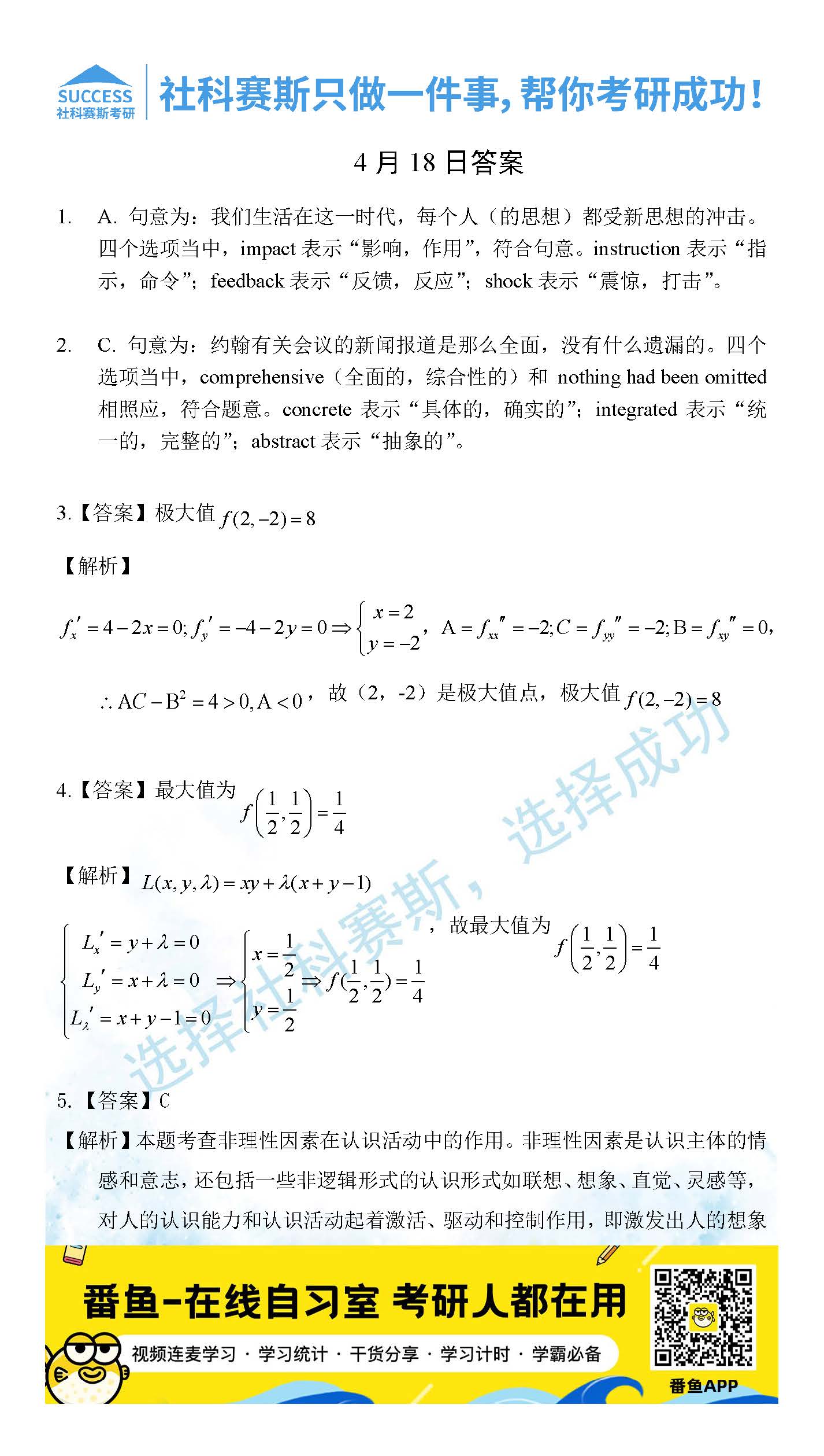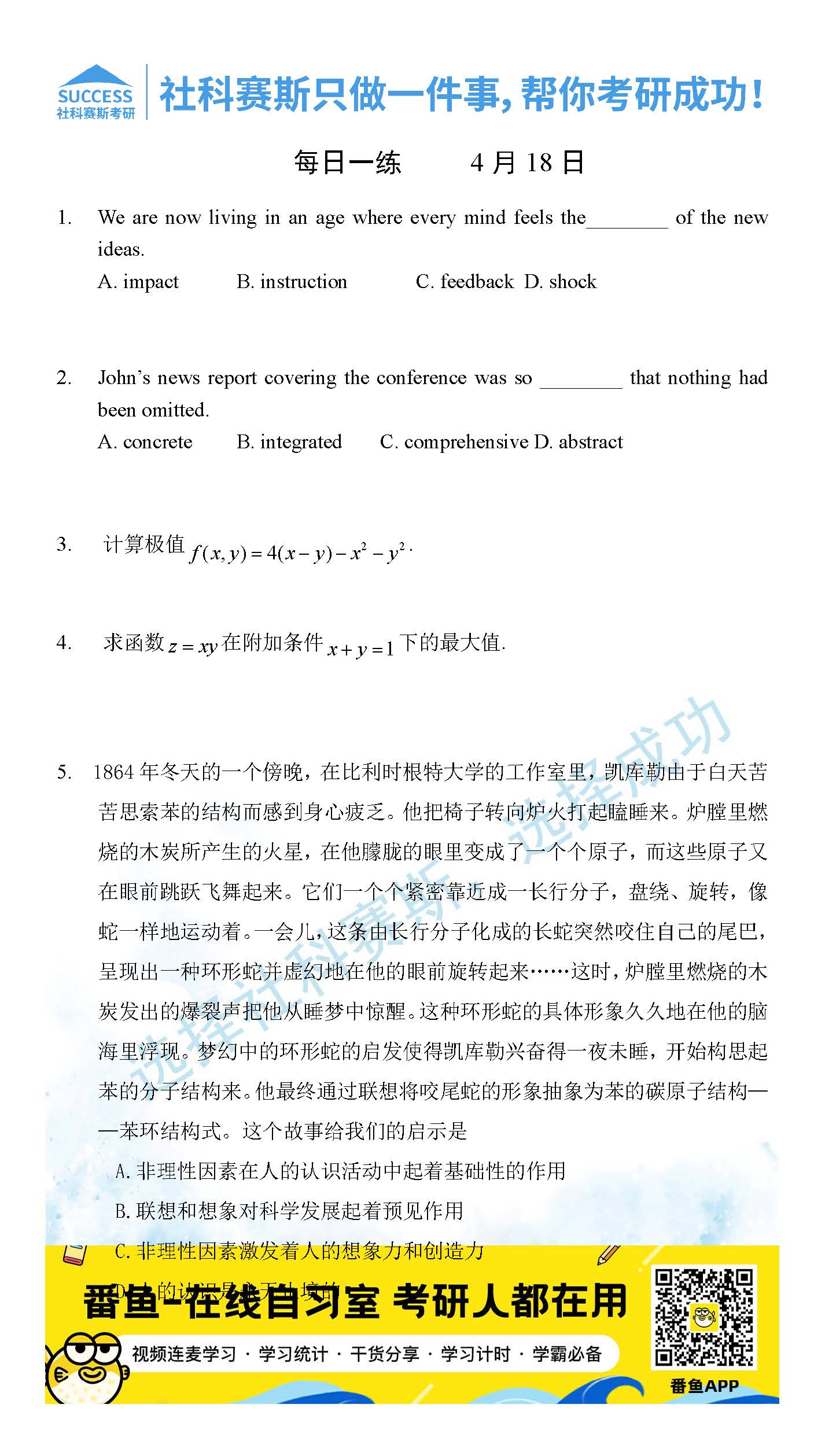 ?以上就是社科賽斯考研網小編為大家整理2022考研每日一練:4月18日管理類聯考每日一練及答案的全部內容,希望各位考生堅持利用起來,更多每日一練內容請持續關注社科賽斯考研網