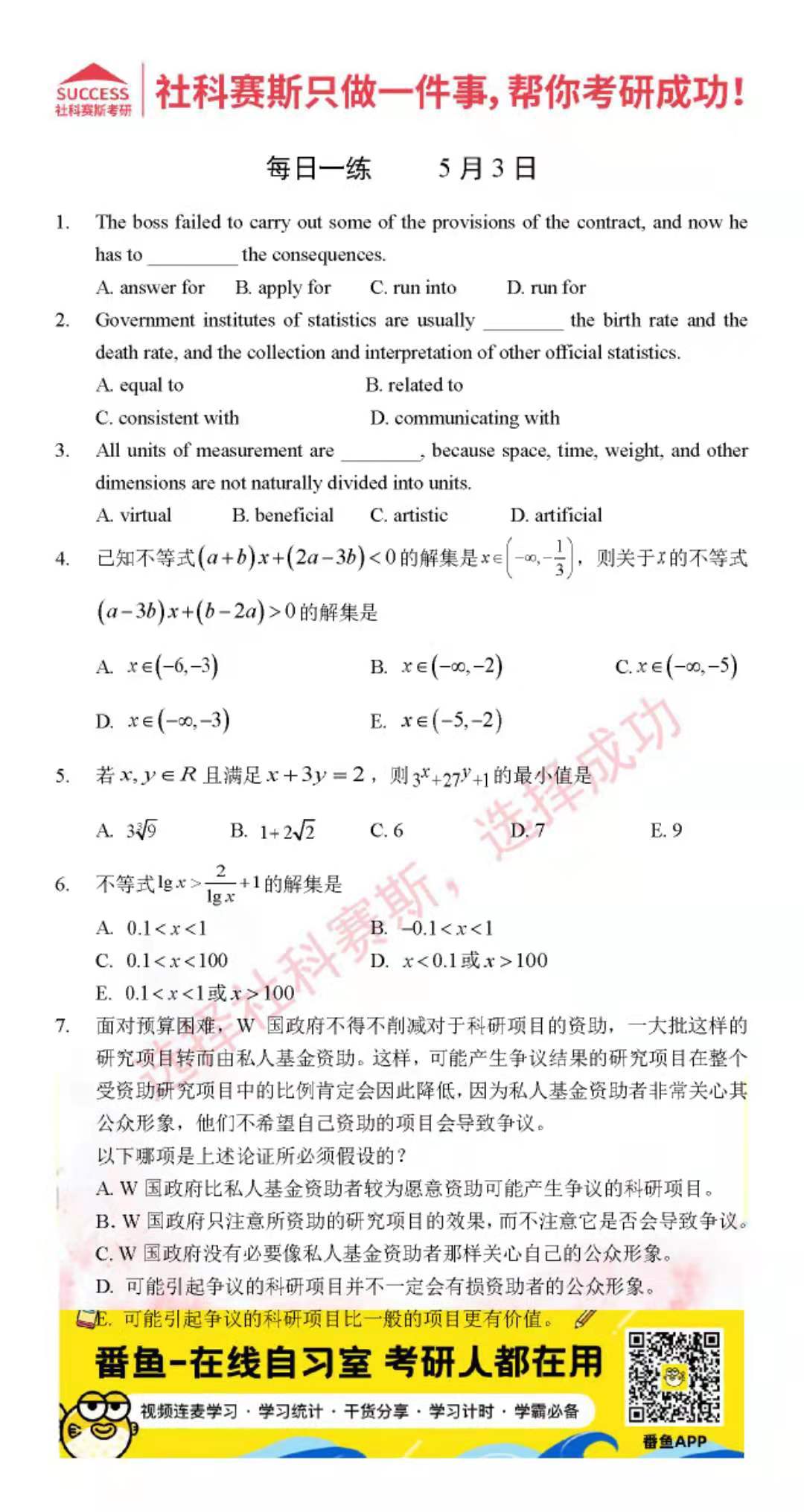2022考研每日一練:5月3日管理類聯(lián)考每日一練及答案
