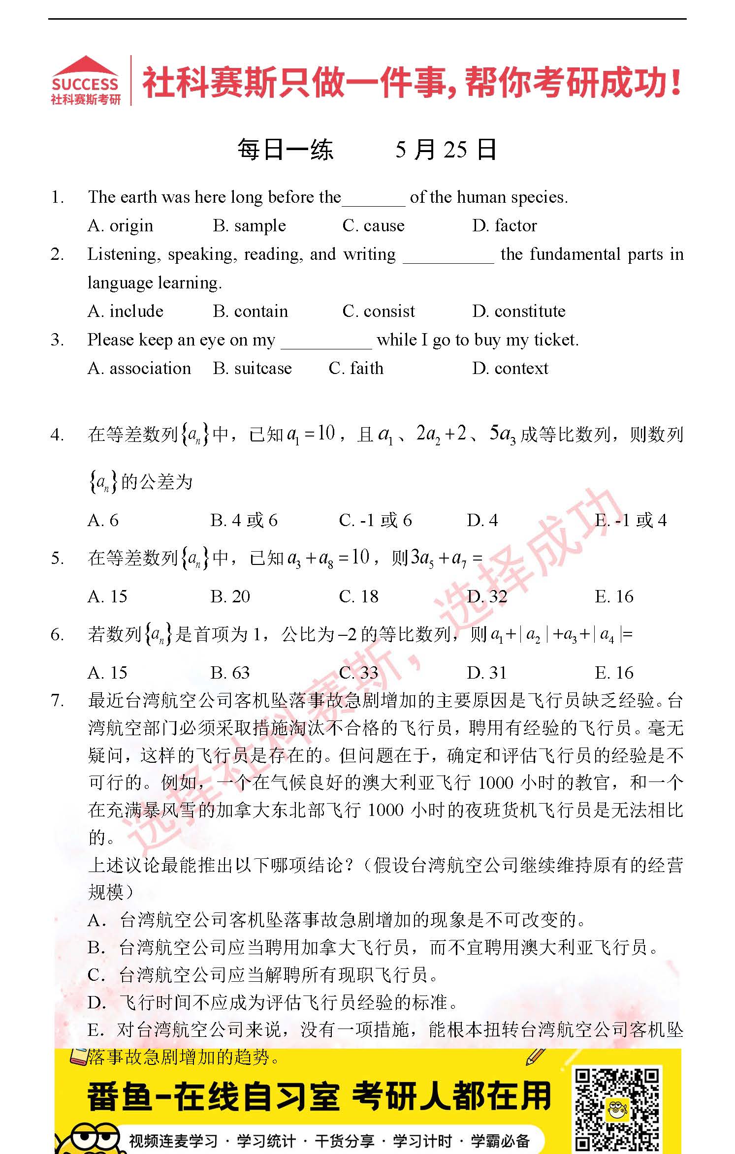 考研是一場持久戰,保持良好的學習習慣,是能確保復習高效的關鍵。今天社科賽斯考研網小編整理了“2022考研每日一練:5月25日管理類聯考每日一練及答案”的內容,希望能對廣大考生有所幫助。
