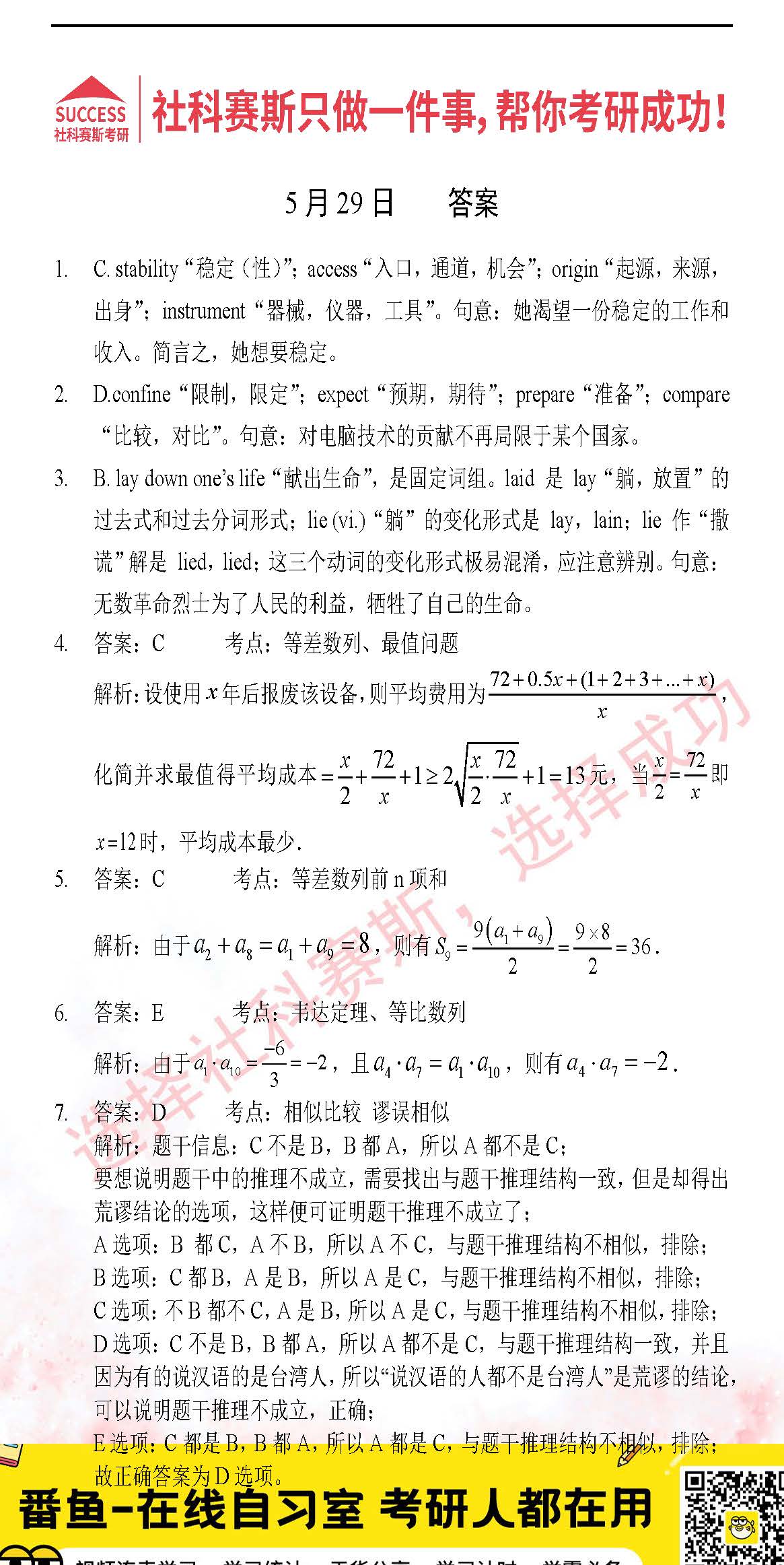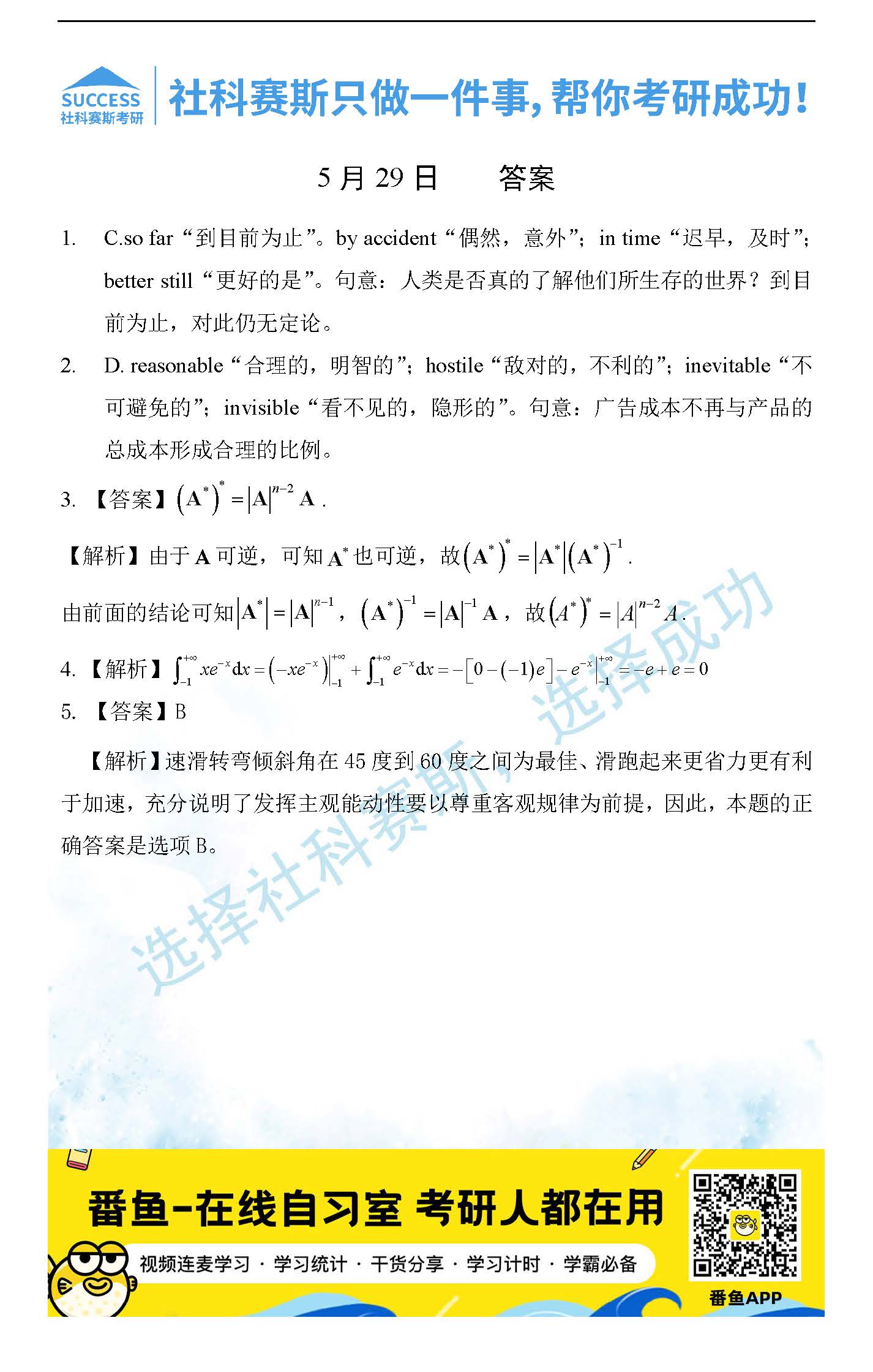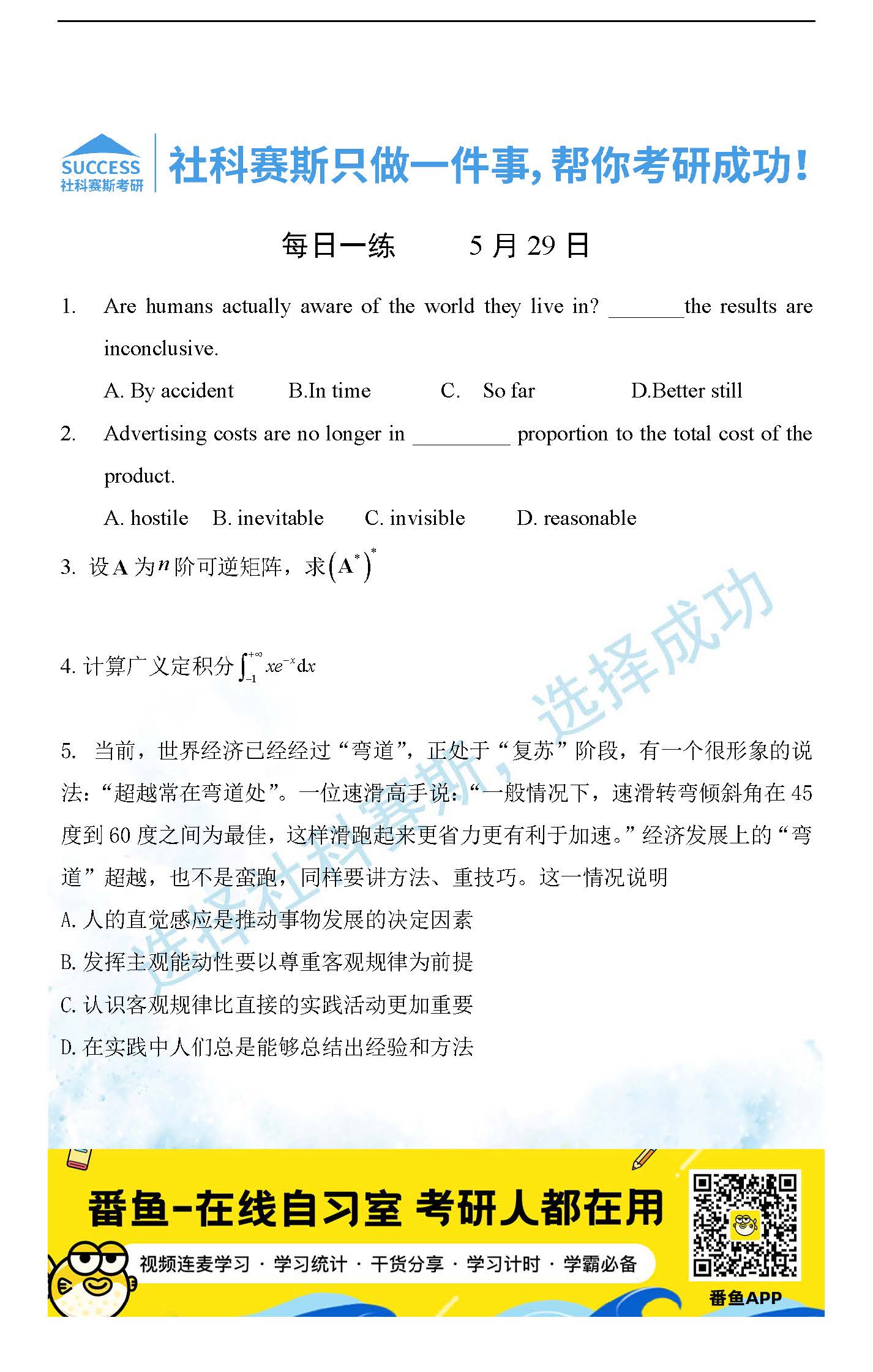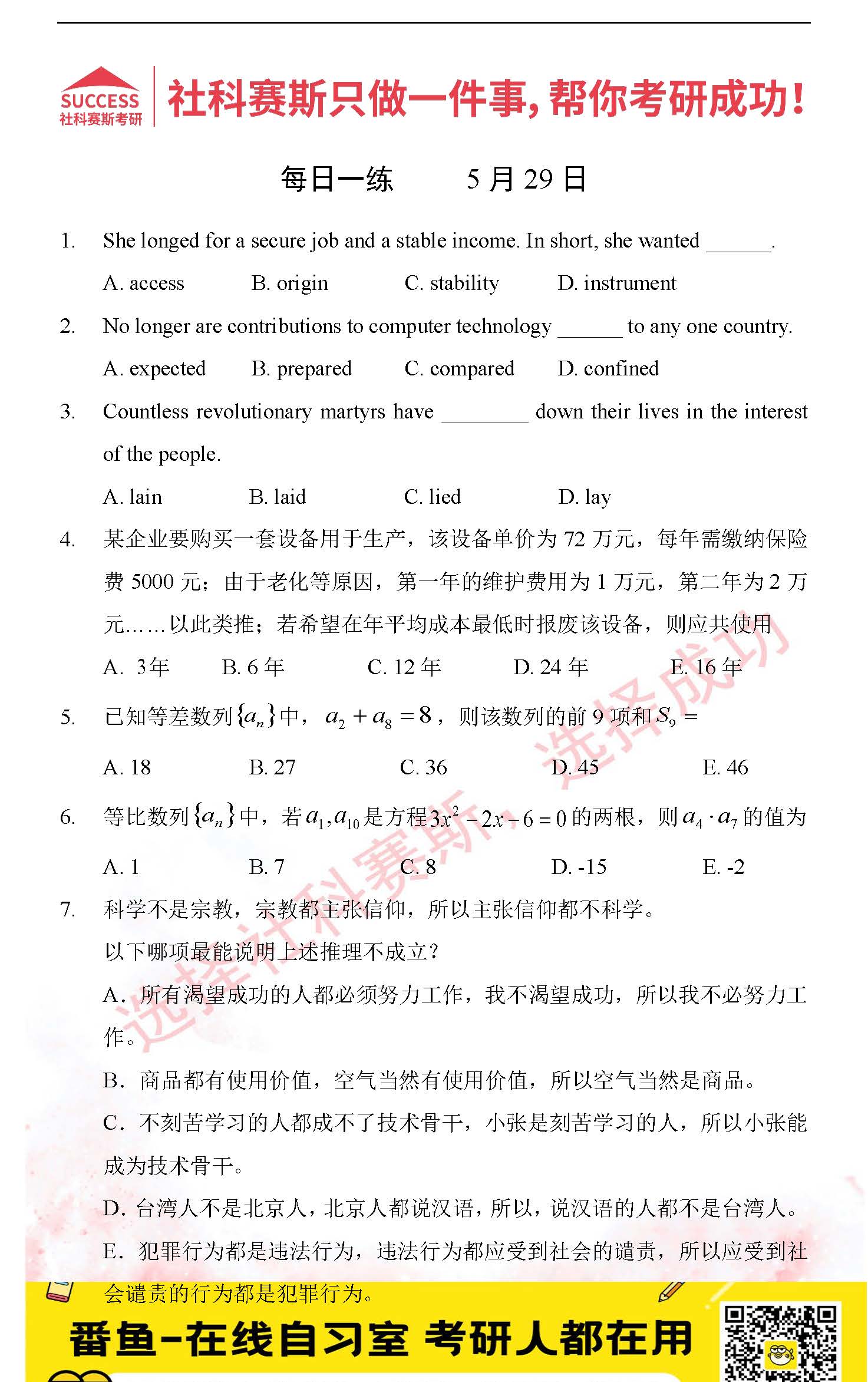 以上就是社科賽斯考研網小編為大家整理2022考研每日一練:5月29日管理類聯考每日一練及答案的全部內容,希望各位考生堅持利用起來,更多每日一練內容請持續關注社科賽斯考研網