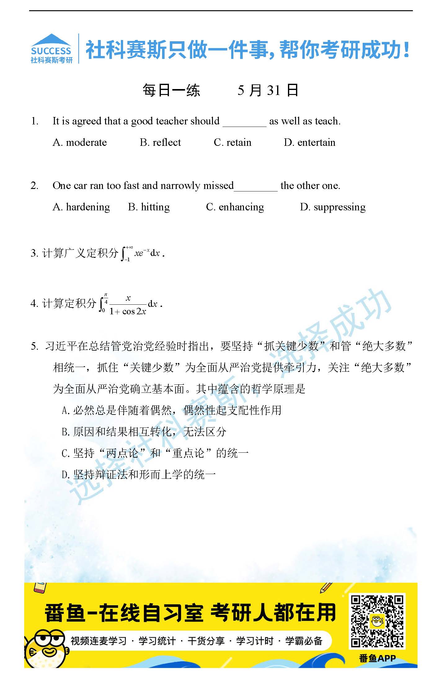 考研是一場(chǎng)持久戰(zhàn),保持良好的學(xué)習(xí)習(xí)慣,是能確保復(fù)習(xí)高效的關(guān)鍵。今天社科賽斯考研網(wǎng)小編整理了“2022考研每日一練:5月31日管理類聯(lián)考每日一練及答案”的內(nèi)容,希望能對(duì)廣大考生有所幫助。