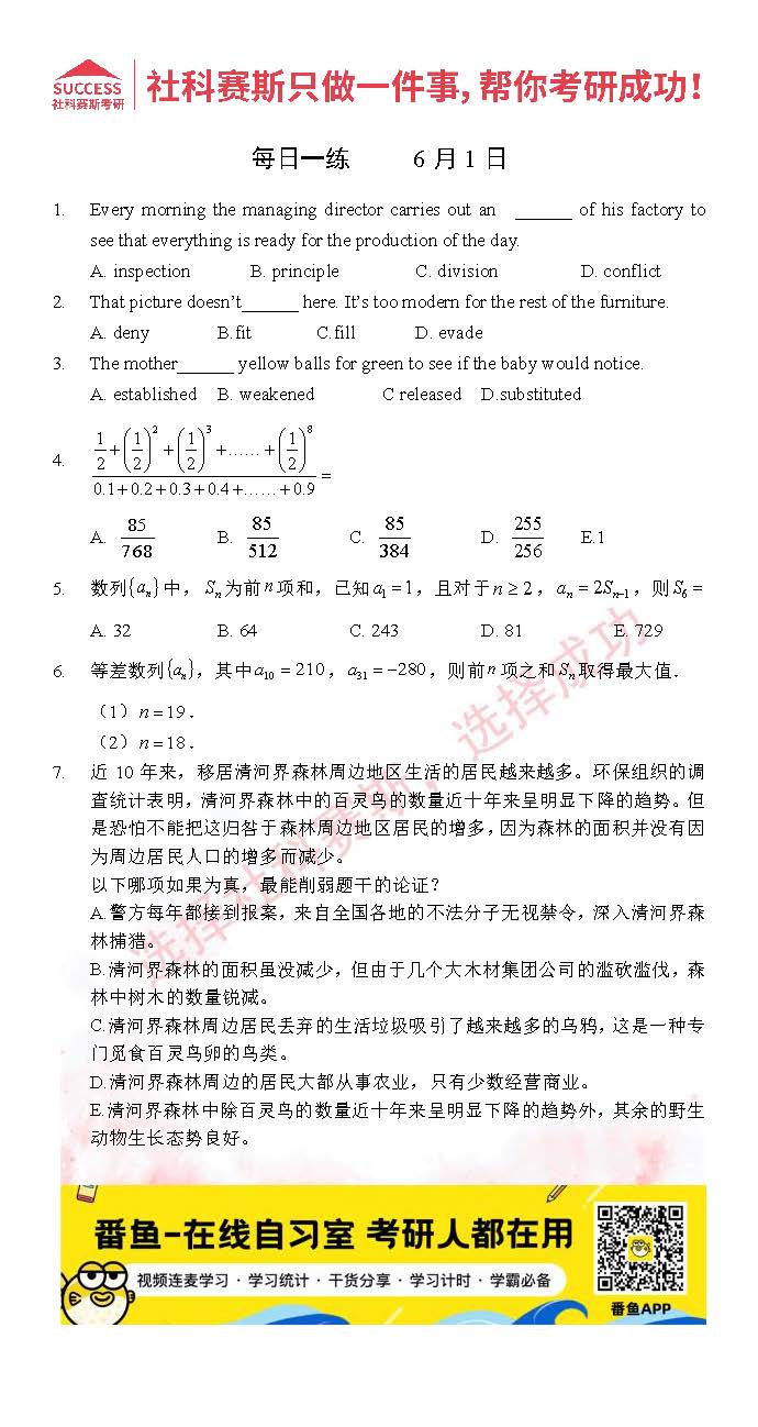 考研是一場持久戰,保持良好的學習習慣,是能確保復習高效的關鍵。今天社科賽斯考研網小編整理了“2022考研每日一練:6月1日管理類聯考每日一練及答案”的內容,希望能對廣大考生有所幫助。