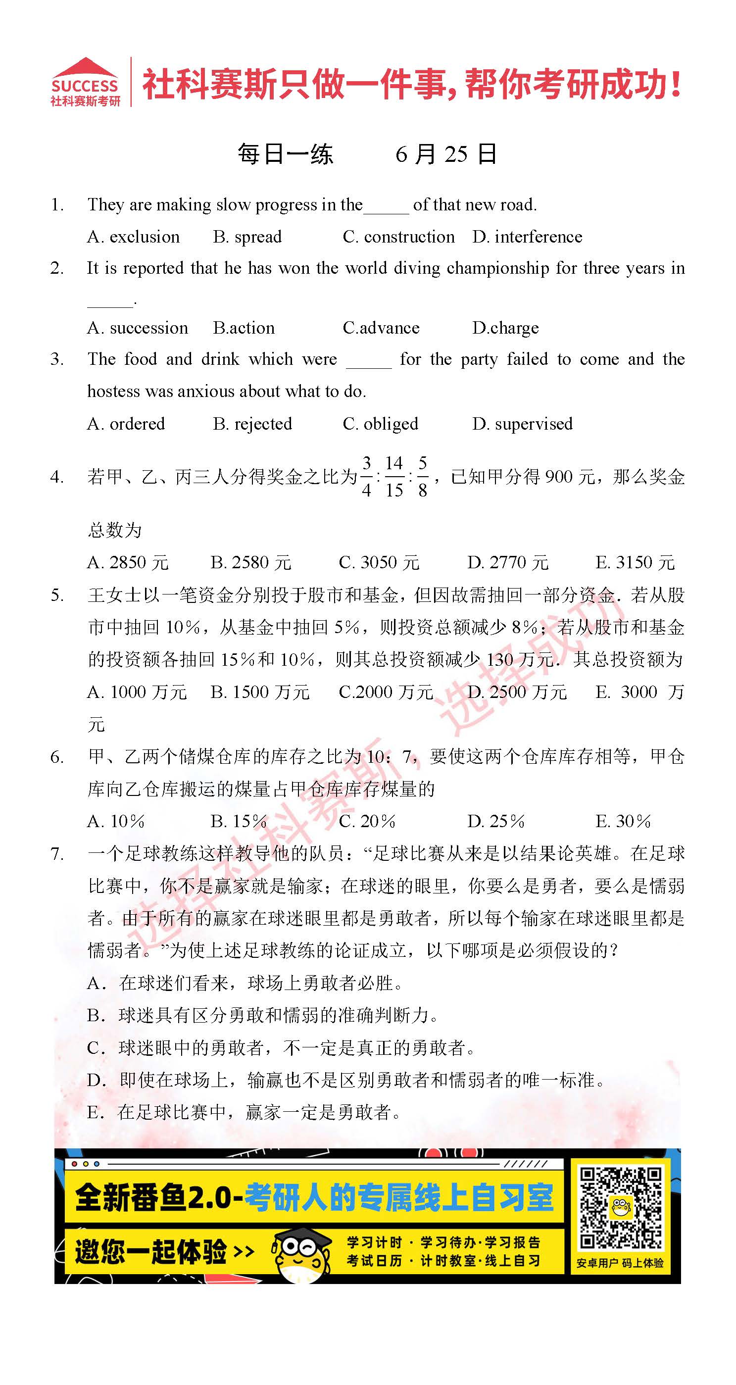 2022考研每日一練:6月25日管理類聯考每日一練及答案