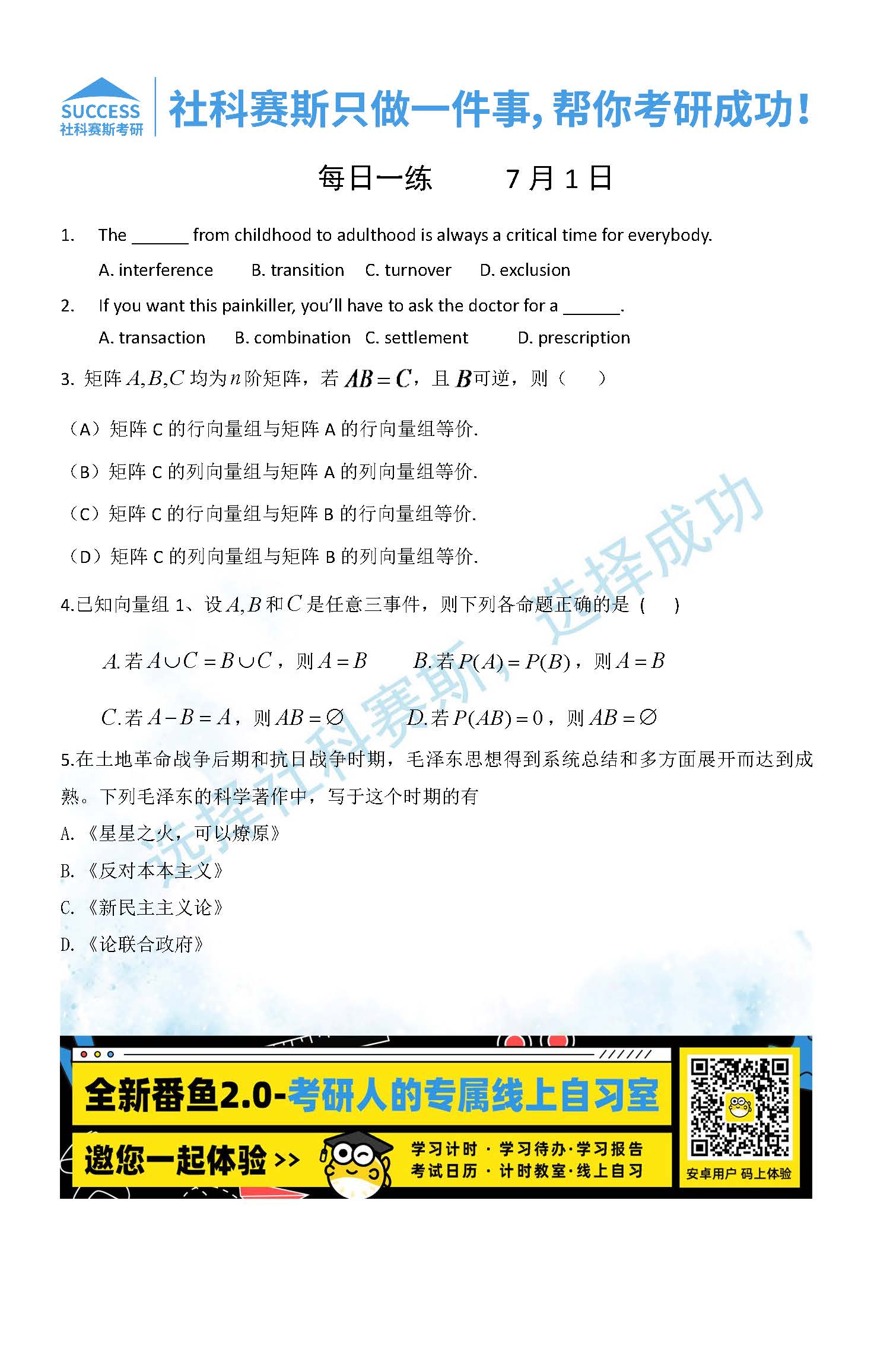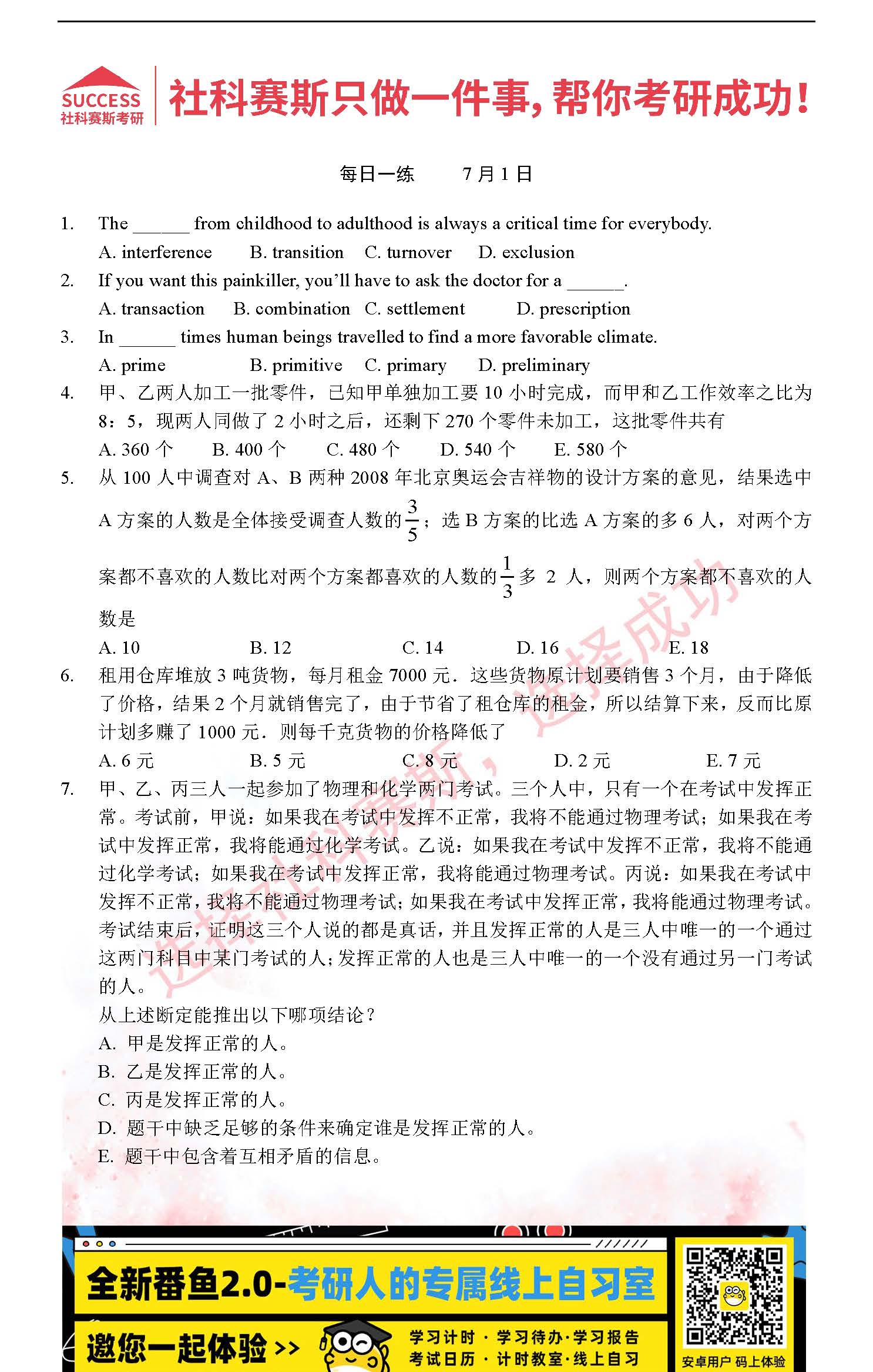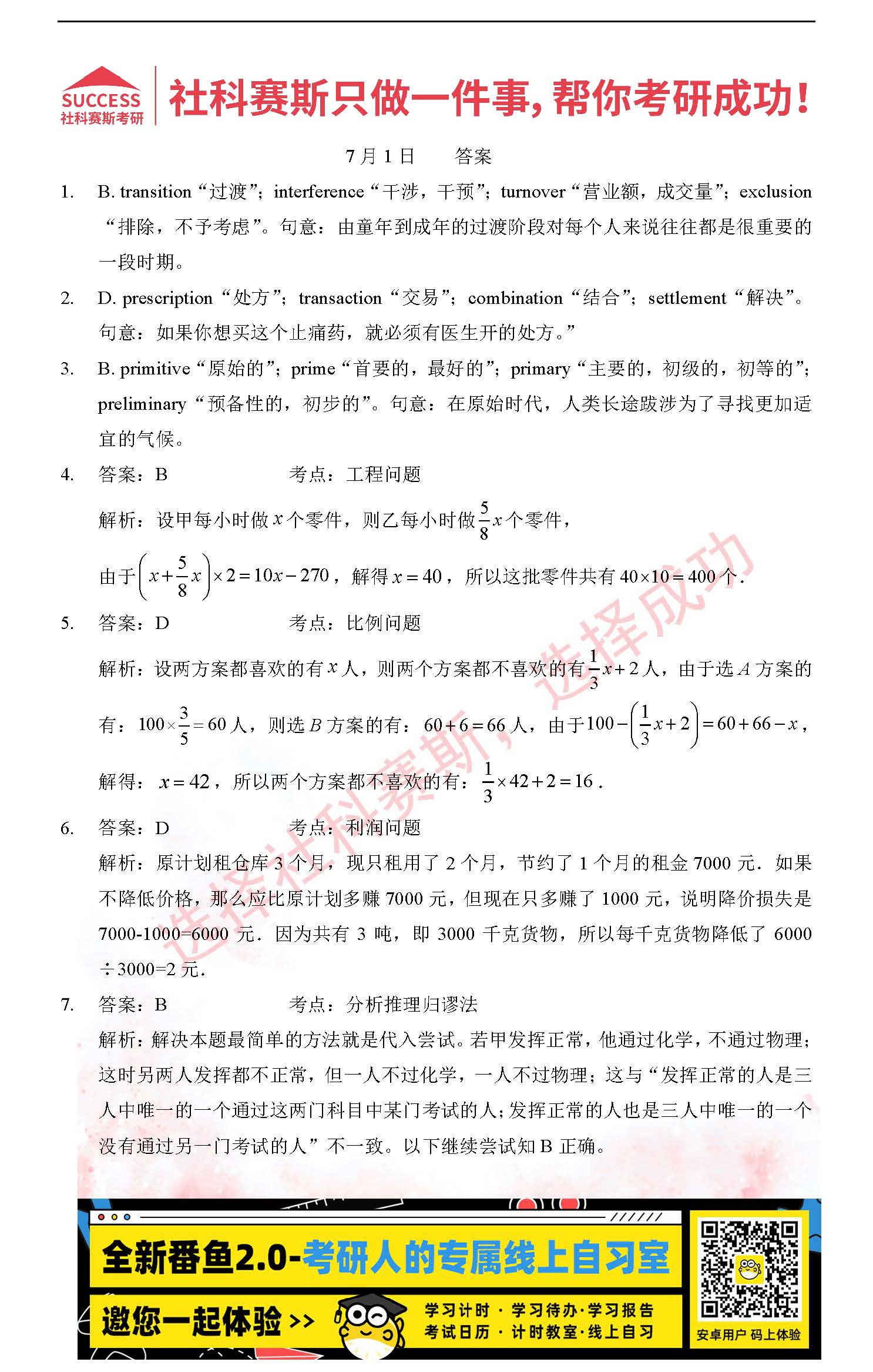 2022考研每日一練:7月1日管理類聯考每日一練及答案