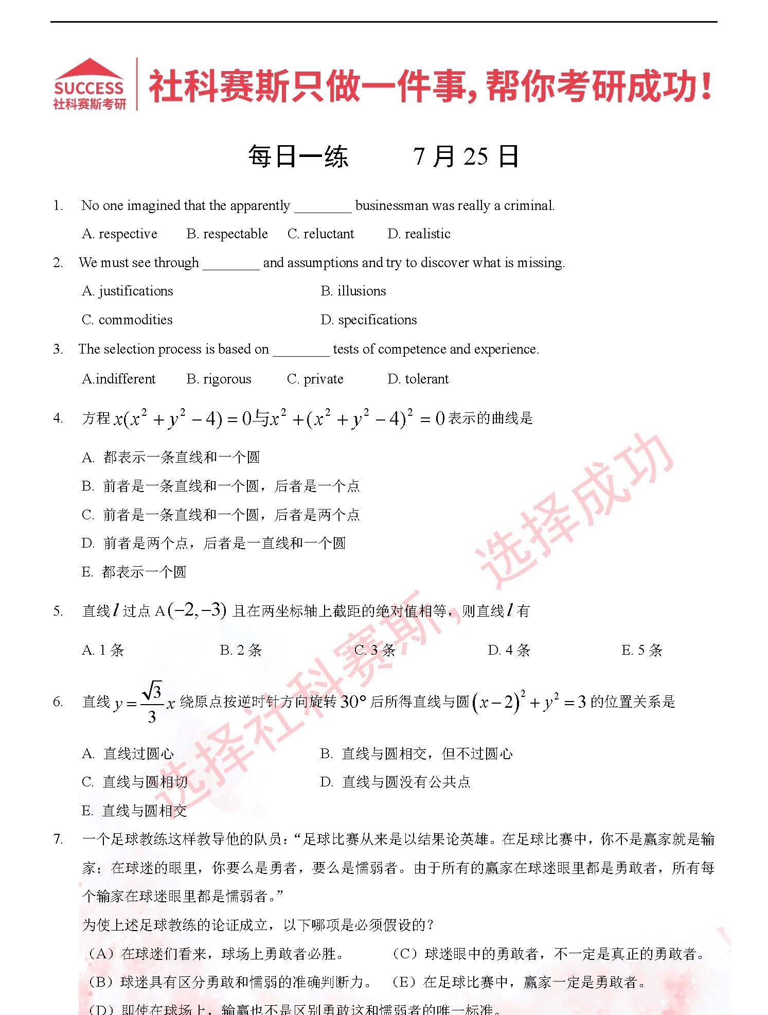 2022考研每日一練:7月25日管理類聯考每日一練及答案
